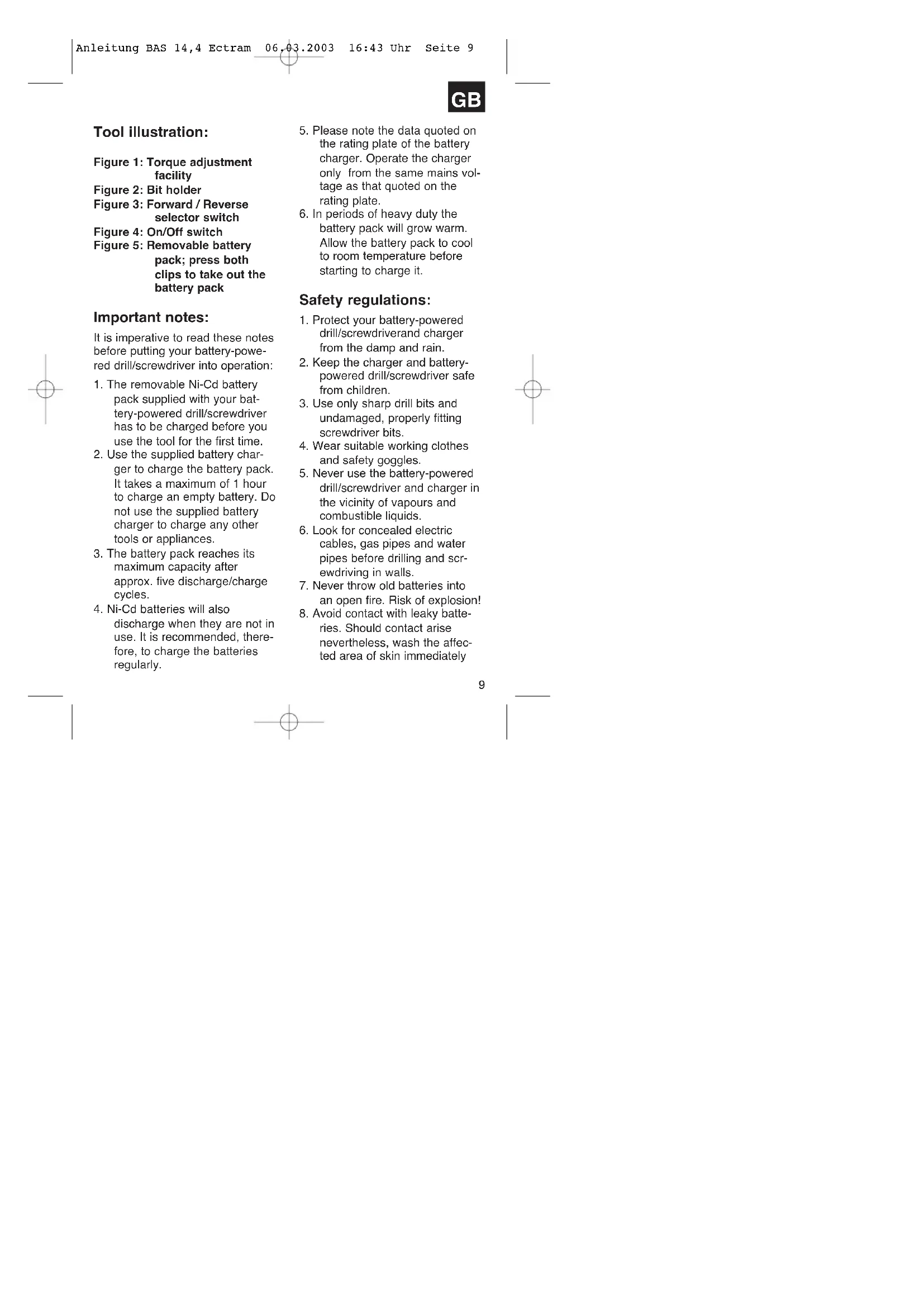 Anleitung BAS 14,4 Ectram 06.03.2003 16:43 Uhr Seite 9with soap and water. If bat- tery acid gets in your eye, rinse the eye with clear water for at least 10 minutes and consult a doctor immediately.