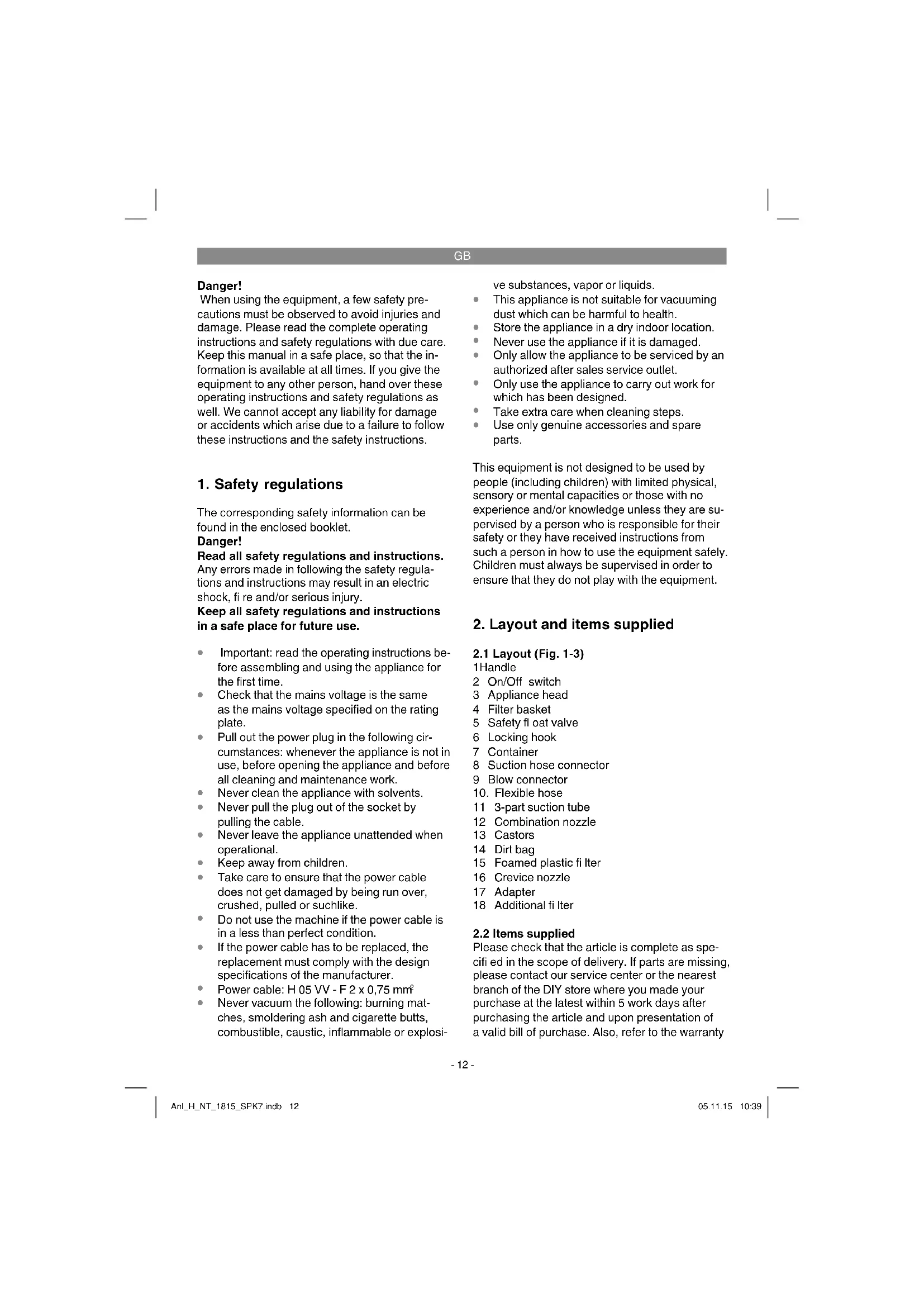 Please check that the article is complete as spe- cifi ed in the scope of delivery. If parts are missing, please contact our service center or the nearest branch of the DIY store where you made your purchase at the latest within 5 work days after purchasing the article and upon presentation of a valid bill of purchase. Also, refer to the warranty Anl_H_NT_1815_SPK7.indb 12Anl_H_NT_1815_SPK7.indb 12 05.11.15 10:3905.11.15 10:39GB