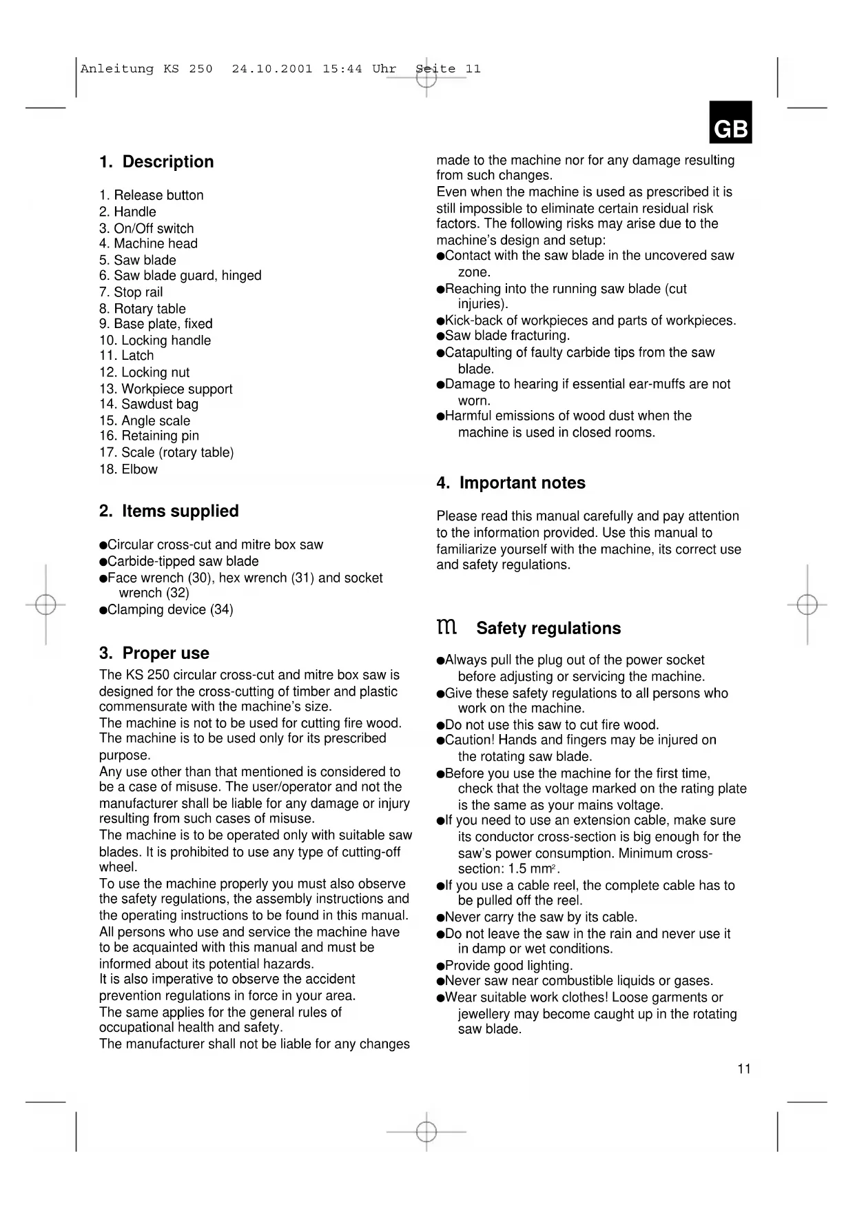 Anleitung KS 250 24.10.2001 15:44 Uhr Seite 11 Operators have to be at least 18 years of age. Trainees of at least 16 years of age are allowed to use the machine under supervision. Keep children away from the machine when it is connected to the power supply. Check the power cable (9). Never use a faulty or damaged power cable. Keep your workplace clean of wood scrap and any unnecessary objects. Persons working on the machine should not be distracted. Note the direction of rotation of the motor and saw blade. After you have switched off the motor, never slow down the saw blade by applying pressure to its side. Fit only blades which are well sharpened and have no cracks or deformations. The machine is to be operated only with tools which conform with prEN 847-1: 1996. Faulty saw blades have to be replaced immediately. Never use saw blades which do not comply with the data specified in this manual. Make sure that the arrow on the saw blade complies with the arrow marked on the machine. Make certain that the saw blade does not touch the rotary table in any setting. To do so, pull out the power plug and tilt the saw blade by hand into the 45° position and the 90° position. If necessary, re-adjust the saw head as described in Section C/F. It is imperative to make sure that all the devices used to cover the saw blade are in good working order. Never wedge the hinged guard hood in open position. Never dismantle the machine’s safety devices or put them out of operation. Damaged or faulty safety devices have to be replaced immediately. Never cut workpieces which are too small to hold securely in your hand. Do not place your hands in awkward positions where one or both may slip suddenly and touch the saw blade. When working with long workpieces, use an additional support (table, stand, etc.) to prevent the machine from tipping over. Always clamp round workpieces such as dowel rods etc. with suitable devices. There must be no nails or other foreign bodies in that part of the workpiece you want to cut. Always stand to the side of the saw blade when working with the saw. Never load the machine so much that it cuts out. Always press the workpiece firmly against the table and the stop rail to prevent it from wobbling or twisting. Make sure that off-cuts can be removed from the side of the saw blade. If not, they may catch on the saw blade crown and be catapulted into the surrounding area. Never saw several workpieces simultaneously. Never remove loose splinters, chips or jammed pieces of wood when the saw blade is running. To rectify faults or remove jammed pieces of wood, always switch off the machine first. - Pull out the power plug! Conversions, adjustments, measurements and cleaning jobs are to be performed only when the motor is switched off. - Pull out the power plug! Before you switch on the machine, check that all wrenches and adjustment tools have been removed. When you leave your workplace, switch off the motor and pull out the power plug. Electric installation work, repairs and maintenance are to be carried out only by specialists. All guards and safety devices have to be refitted immediately after completion of any repairs or maintenance. It is imperative to observe the manufacturer’s safety, operating and maintenance instructions as well as the dimensions quoted in the technical data. It is imperative to observe the accident prevention regulations in force in your area as well as all other generally recognized rules of safety. Note the information published by your profes- sional associations.(VBG7j) Switch on the dust extraction system each time you use the machine. The machine may be used in closed rooms only in conjunction with a suitable vacuum extraction system. The circular cross-cut must be connected to a 230 V socket-outlet with a minimum 10 A fuse. Never use light-duty machines for heavy-duty work. Never use the cable for any purpose other than that for which it is intended! Adopt a firm standing position and keep your balance at all times. Check the tool for signs of damage! Before you carry on using the tool it is imperative to check that its safety devices and any slightly damaged parts are working properly and in the way intended. Check that the moving parts work properly and do not jam or whether any of the parts are