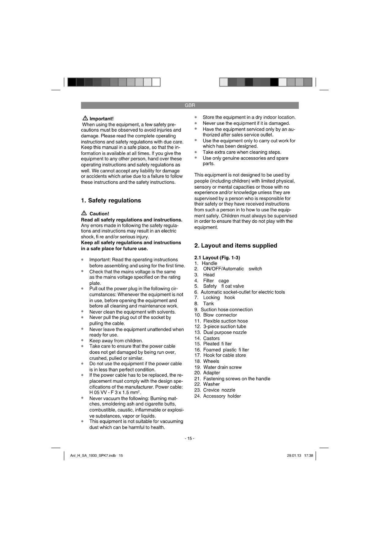 Fitting the equipment head (Fig. 6) The equipment head (3) is fastened to the tank (8) by the locking hook (7). To remove the equip- ment head (3), open the locking hook (7) and take off the equipment head (3). When fi tting the equipment head (3), make sure that the locking hook (7) locks into place correctly. Fitting the wheels (Fig. 5) Fit the wheels in accordance with Fig. 5. Anl_H_SA_1930_SPK7.indb 16Anl_H_SA_1930_SPK7.indb 16 29.01.13 17:3829.01.13 17:38GBR
