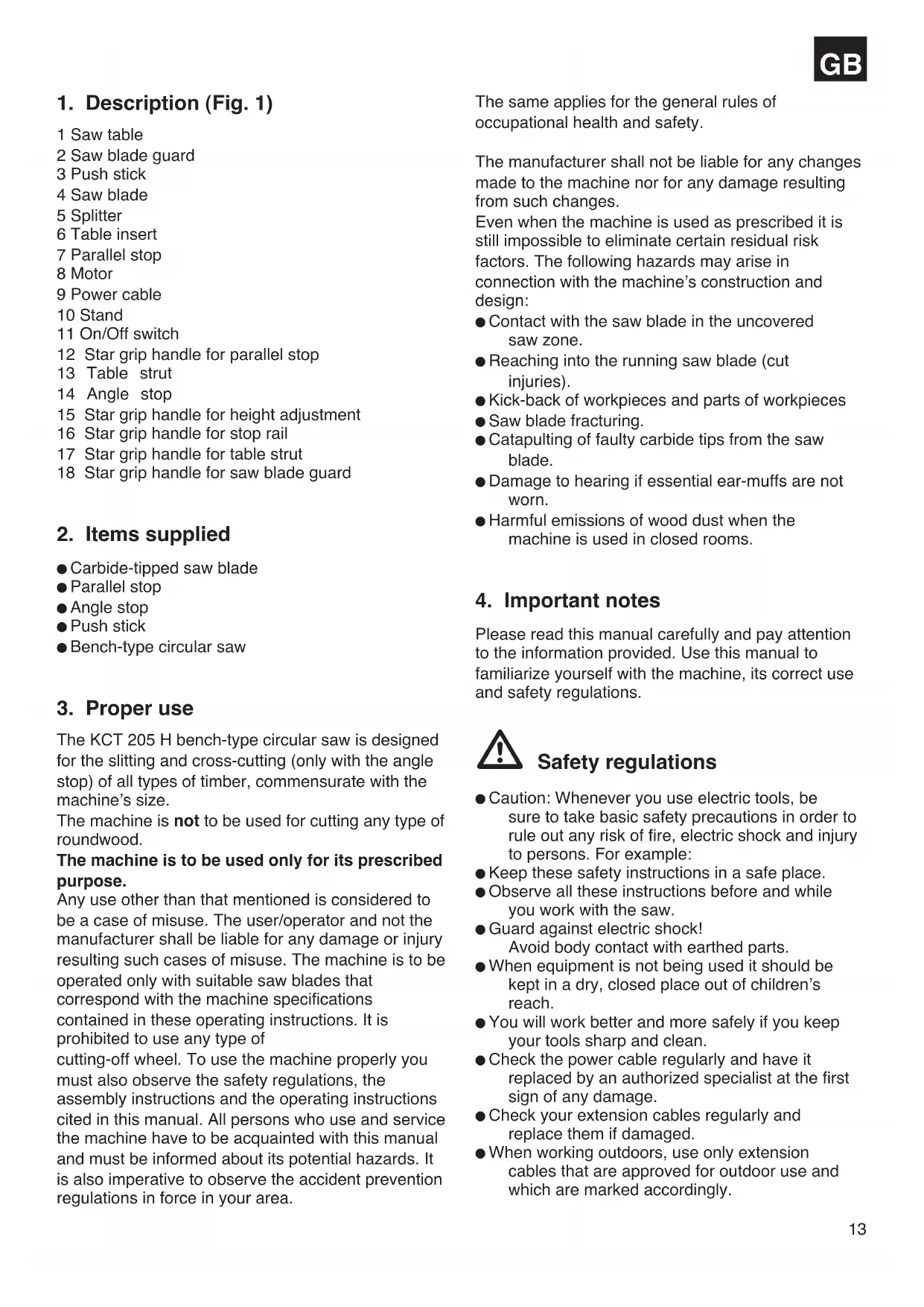 The KCT 205 H bench-type circular saw is designed for the slitting and cross-cutting (only with the angle stop) of all types of timber, commensurate with the machine’s size. The machine is not to be used for cutting any type of roundwood. The machine is to be used only for its prescribed purpose. Any use other than that mentioned is considered to be a case of misuse. The user/operator and not the manufacturer shall be liable for any damage or injury resulting such cases of misuse. The machine is to be operated only with suitable saw blades that correspond with the machine specifications contained in these operating instructions. It is prohibited to use any type of cutting-off wheel. To use the machine properly you must also observe the safety regulations, the assembly instructions and the operating instructions cited in this manual. All persons who use and service the machine have to be acquainted with this manual and must be informed about its potential hazards. It is also imperative to observe the accident prevention regulations in force in your area. The same applies for the general rules of occupational health and safety. The manufacturer shall not be liable for any changes made to the machine nor for any damage resulting from such changes. Even when the machine is used as prescribed it is still impossible to eliminate certain residual risk factors. The following hazards may arise in connection with the machine’s construction and design: Contact with the saw blade in the uncovered saw zone. Reaching into the running saw blade (cut injuries). Kick-back of workpieces and parts of workpieces Saw blade fracturing. Catapulting of faulty carbide tips from the saw blade. Damage to hearing if essential ear-muffs are not worn. Harmful emissions of wood dust when the machine is used in closed rooms.