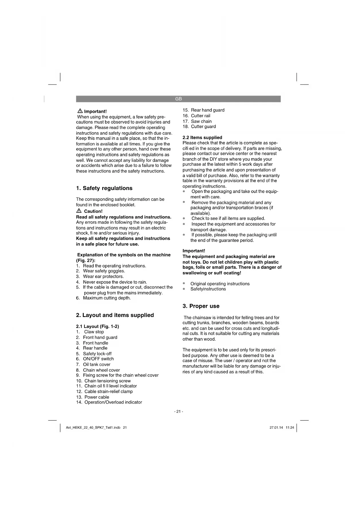 The chainsaw is intended for felling trees and for cutting trunks, branches, wooden beams, boards etc. and can be used for cross cuts and longitudi- nal cuts. It is not suitable for cutting any materials other than wood. The equipment is to be used only for its prescri- bed purpose. Any other use is deemed to be a case of misuse. The user / operator and not the manufacturer will be liable for any damage or inju- ries of any kind caused as a result of this. Anl_HEKE_22_40_SPK7_Teil1.indb 21Anl_HEKE_22_40_SPK7_Teil1.indb 21 27.01.14 11:2427.01.14 11:24GB