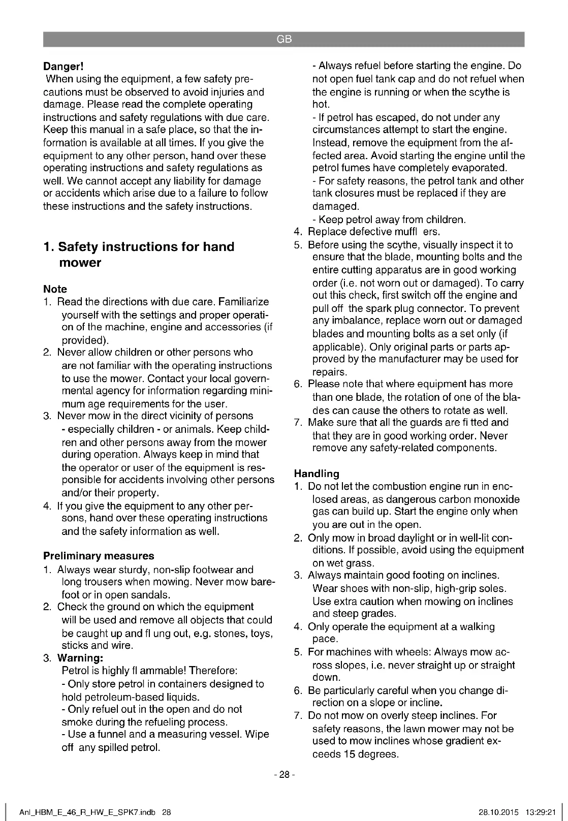 ne, exhaust and the area around the fuel tank free from grass, leaves and leaking grease (oil). Anl_HBM_E_46_R_HW_E_SPK7.indb 29Anl_HBM_E_46_R_HW_E_SPK7.indb 29 28.10.2015 13:29:2128.10.2015 13:29:21GB