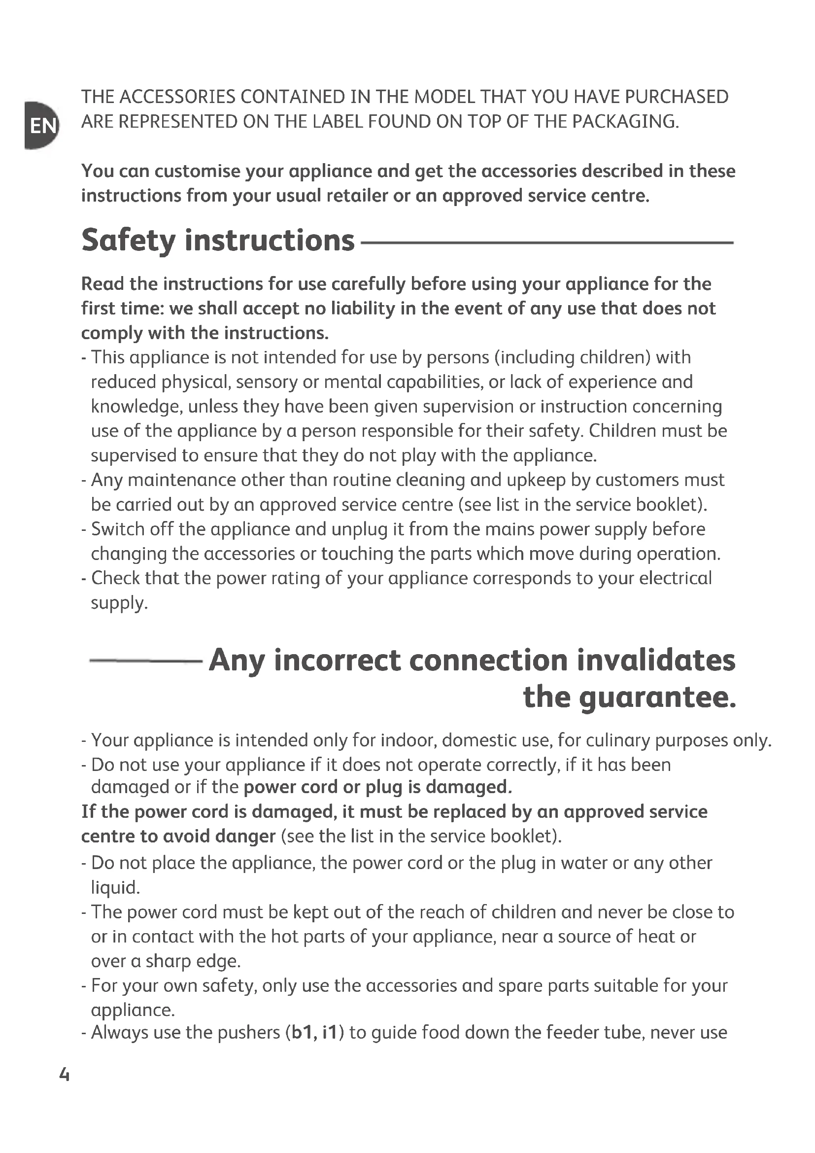 THE ACCESSORIES CONTAINED IN THE MODEL THAT YOU HAVE PURCHASED ARE REPRESENTED ON THE LABEL FOUND ON TOP OF THE PACKAGING. You can customise your appliance and get the accessories described in these instructions from your usual retailer or an approved service centre. Safety instructions Read the instructions for use carefully before using your appliance for the first time: we shall accept no liability in the event of any use that does not comply with the instructions. - This appliance is not intended for use by persons (including children) with reduced physical, sensory or mental capabilities, or lack of experience and knowledge, unless they have been given supervision or instruction concerning use of the appliance by a person responsible for their safety. Children must be supervised to ensure that they do not play with the appliance. - Any maintenance other than routine cleaning and upkeep by customers must be carried out by an approved service centre (see list in the service booklet). - Switch off the appliance and unplug it from the mains power supply before changing the accessories or touching the parts which move during operation. - Check that the power rating of your appliance corresponds to your electrical supply. Any incorrect connection invalidates the guarantee. - Your appliance is intended only for indoor, domestic use, for culinary purposes only. - Do not use your appliance if it does not operate correctly, if it has been damaged or if the power cord or plug is damaged. If the power cord is damaged, it must be replaced by an approved service centre to avoid danger (see the list in the service booklet). - Do not place the appliance, the power cord or the plug in water or any other liquid. - The power cord must be kept out of the reach of children and never be close to or in contact with the hot parts of your appliance, near a source of heat or over a sharp edge. - For your own safety, only use the accessories and spare parts suitable for your appliance. - Always use the pushers (b1, i1) to guide food down the feeder tube, never useEN
