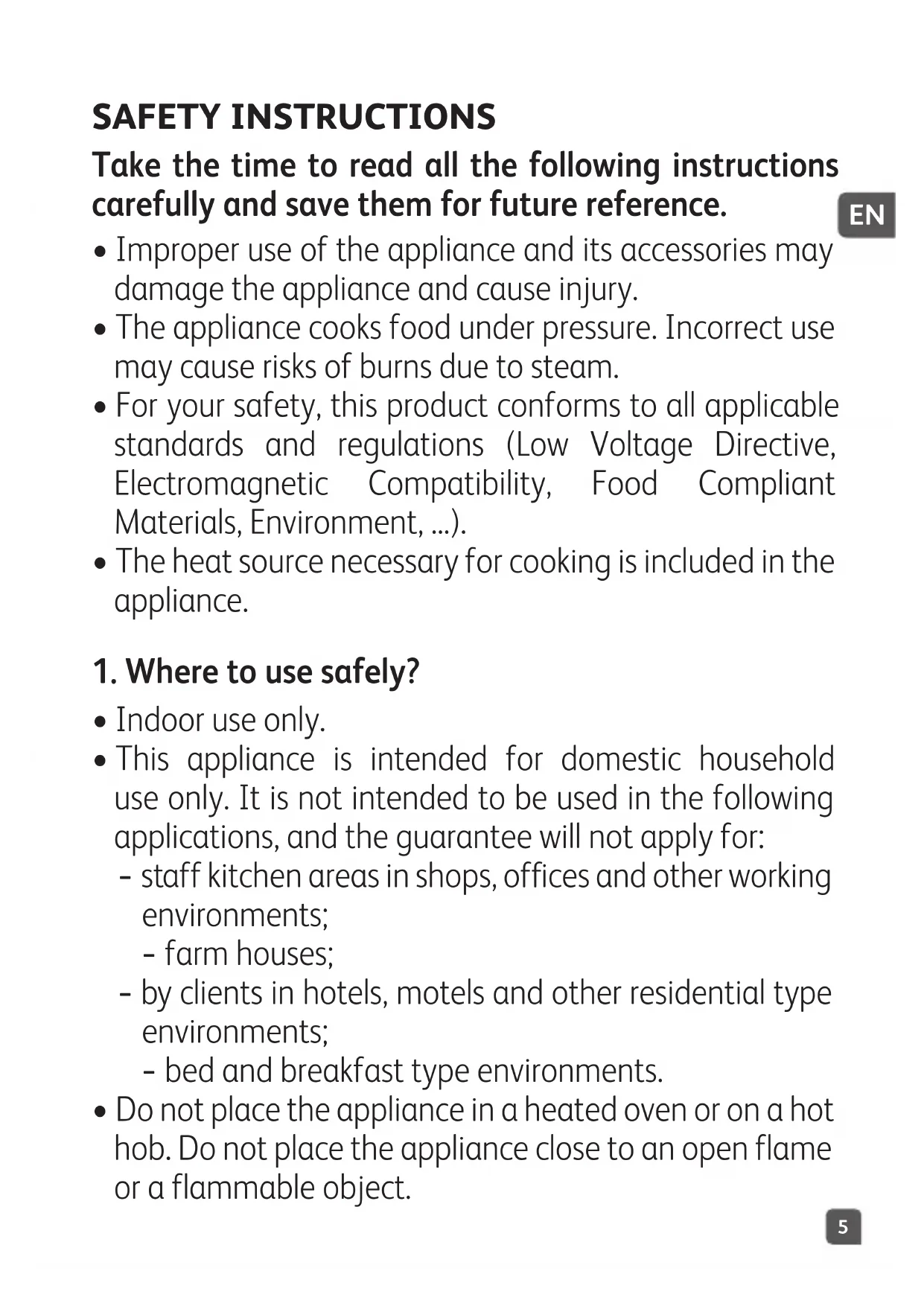 - The appliance cooks food under pressure. Incorrect use may cause risks of burns due to steam.