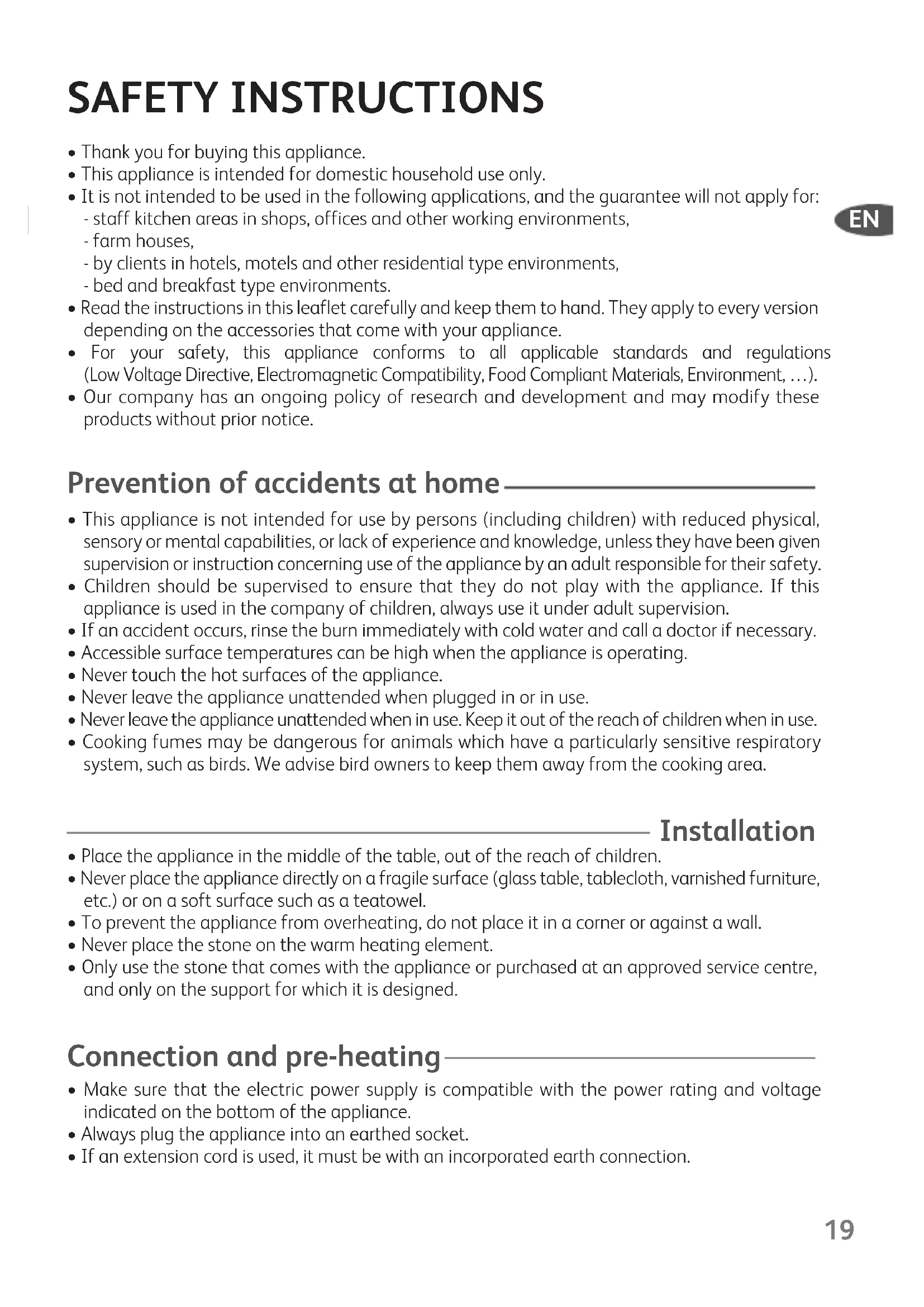 - Place the appliance in the middle of the table, out of the reach of children.• Never place the appliance directly on a fragile surface (glass table, tablecloth, varnished furniture,etc.) or on a soft surface such as a teatowel.• To prevent the appliance from overheating, do not place it in a corner or against a wall.• Never place the stone on the warm heating element.• Only use the stone that comes with the appliance or purchased at an approved service centre,and only on the support for which it is designed. Connection and pre-heating