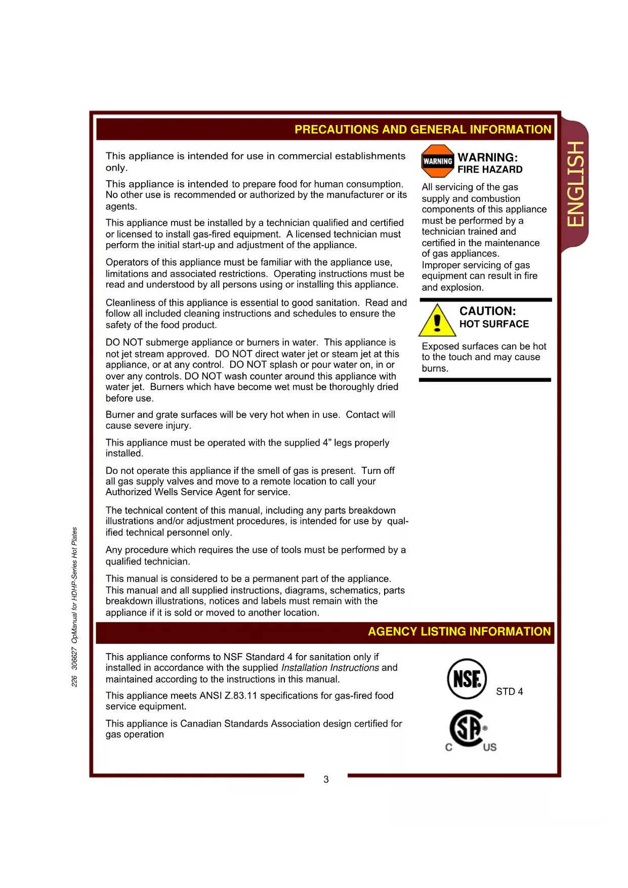 226 306627 OpManual for HDHP-Series Hot Plates IMPORTANT: Use only factory authorized service parts and replacement filters. For factory authorized service, or to order factory authorized replacement parts, contact your Wells authorized service agency, or call: Wells Manufacturing 10 Sunnen Dr. St. Louis, MO 63143 Service Parts Dept. phone: (888) 356-5362 fax: (314) 781-2714 Service Parts Department can supply you with the name and telephone number of the WELLS AUTHORIZED SERVICE AGENCY nearest you.ENGLISH NOTES