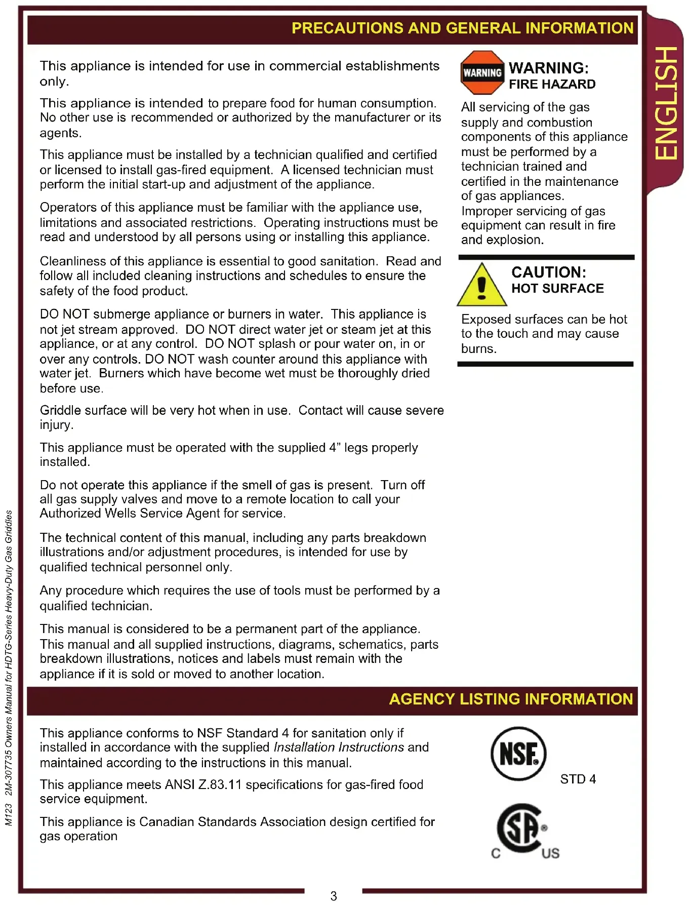 THERMOBULB ASSEMBLIES M123 2M-307735 Owners Manual for HDTG-Series Heavy-Duty Gas GriddlesENGLISH This appliance is intended for use in commercial establishments only. This appliance is intended to prepare food for human consumption. No other use is recommended or authorized by the manufacturer or its agents. This appliance must be installed by a technician qualified and certified or licensed to install gas-fired equipment. A licensed technician must perform the initial start-up and adjustment of the appliance. Operators of this appliance must be familiar with the appliance use, limitations and associated restrictions. Operating instructions must be read and understood by all persons using or installing this appliance.