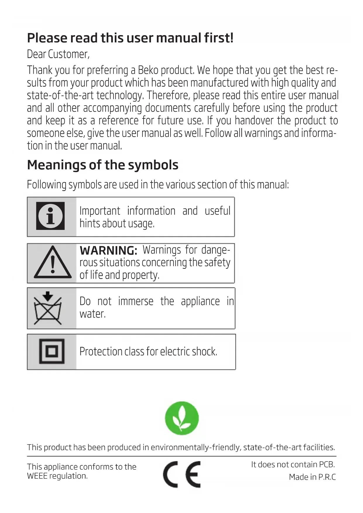 Please read this user manual first! Dear Customer, Thank you for preferring a Beko product. We hope that you get the best re- sults from your product which has been manufactured with high quality and state-of-the-art technology. Therefore, please read this entire user manual and all other accompanying documents carefully before using the product and keep it as a reference for future use. If you handover the product to someone else, give the user manual as well. Follow all warnings and informa- tion in the user manual. Meanings of the symbols Following symbols are used in the various section of this manual: