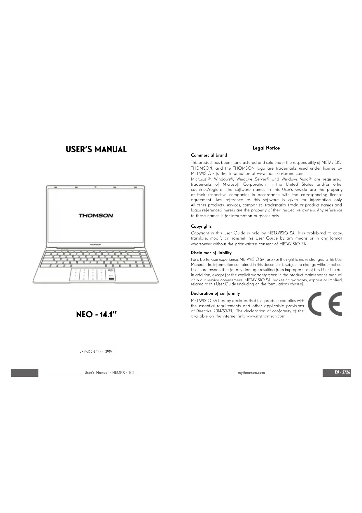 NEO - 14.1’’ VERSION 1.0 - 0919 Legal Notice Commercial brand This product has been manufactured and sold under the responsibility of METAVISIO. THOMSON, and the THOMSON logo are trademarks used under license by METAVISIO - further information at www.thomson-brand.com. Microsoft®, Windows®, Windows Server® and Windows Vista® are registered trademarks of Microsoft Corporation in the United States and/or other countries/regions. The software names in this User’s Guide are the property of their respective companies in accordance with the corresponding license agreement. Any reference to this software is given for information only. All other products, services, companies, trademarks, trade or product names and logos referenced herein are the property of their respective owners. Any reference to these names is for information purposes only. Copyrights Copyright in this User Guide is held by METAVISIO SA It is prohibited to copy, translate, modify or transmit this User Guide by any means or in any format whatsoever without the prior written consent of METAVISIO SA . Disclaimer of liability For a better user experience, METAVISIO SA reserves the right to make changes to this User Manual. The information contained in this document is subject to change without notice. Users are responsible for any damage resulting from improper use of this User Guide. In addition, except for the explicit warranty given in the product maintenance manual or in our service commitment, METAVISIO SA makes no warranty, express or implied, related to this User Guide (including on the formulations chosen). Declaration of conformity METAVISIO SA hereby declares that this product complies with the essential requirements and other applicable provisions of Directive 2014/53/EU. The declaration of conformity of the available on the internet link: www.mythomson.comEN - 2928 - EN User’s Manual - NEOPX - 14.1’’ mythomson.com - Important safety instructions - This unit should be used in an environment with an ambient temperature between 5°C (41°F) and 35°C (95°F). Do not expose the unit to rain or moisture and keep it away from liquids. In case of splashing water or other liquid on the unit, immediately switch off the unit and wait until it is completely dry before turning it on again. Do not expose the device directly to solar radiation Do not use strong solvents, liquid detergents or other chemicals on or near the surface of the unit to prevent corrosion or deterioration of the surface of the unit. Do not expose the camera to a dusty environment. Do not use the unit during a gas leak. Do not expose the device to strong magnetic or electric elds. You can run the device through airport x-ray detectors. However, it is recommended not to pass your device through the magnetic detection portals or expose it to portable detectors. Do not place any objects on the device. Do not place the unit on an uneven or unstable surface. Make sure to protect the unit from falls or any other impact that may damage it. Do not leave the appliance on or loaded on your lap or any other part of your body to avoid any risk of heat-related injuries. Switch off the unit before transporting it or covering it with a material that does not allow optimal air circulation. Do not use damaged power cords, accessories or other devices with your device. We recommend the exclusive use of the accessories (power supply, cables, etc.) supplied with the unit. Use only original batteries. Replacing the battery with an incorrect battery can cause an explosion risk. Do not disassemble, modify or repair the unit yourself, as this may void the warranty. Please back up your important content regularly to avoid data loss. Our company accepts no responsibility for the loss or removal of items contained in the device due to improper use of the hardware or software, lack of maintenance or any other accidental event. This product has been designed to allow proper recycling of parts and components. The symbol representing a crossed-out wheeled bin indicates that the device should not be disposed of with municipal waste. Consult local regulations for disposal of electronic devices. The symbol representing a crossed-out wheeled bin indicates that the battery should not be disposed of with municipal waste. Consult local regulations for battery disposal. To avoid possible hearing damage, do not listen to high sound levels for long periods of time.EN - 3130 - EN User’s Manual - NEOPX - 14.1’’ mythomson.com - Presentation of the device - Front view Note : The presentation of the device and some features may vary by country, model or version.