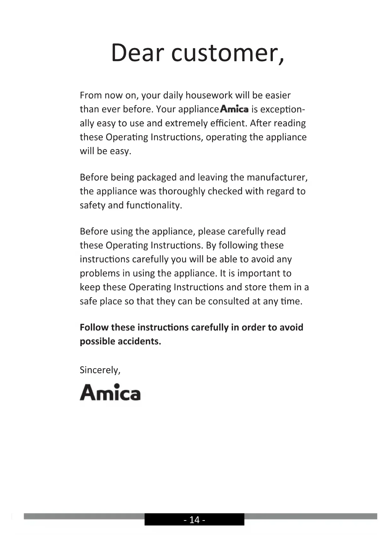 GARANCIA ÉS VÁSÁRLÁS UTÁNI SZERVIZ 180 GARANCIA 180 HU- Tartalomjegyzék- 14 - Dear customer, From now on, your daily housework will be easier than ever before. Your appliance is excepon- ally easy to use and extremely ecient. Aer reading these Operang Instrucons, operang the appliance will be easy. Before being packaged and leaving the manufacturer, the appliance was thoroughly checked with regard to safety and funconality. Before using the appliance, please carefully read these Operang Instrucons. By following these instrucons carefully you will be able to avoid any problems in using the appliance. It is important to keep these Operang Instrucons and store them in a safe place so that they can be consulted at any me. Follow these instrucons carefully in order to avoid possible accidents. Sincerely,- 15 - GUIDELINES CONCERNING