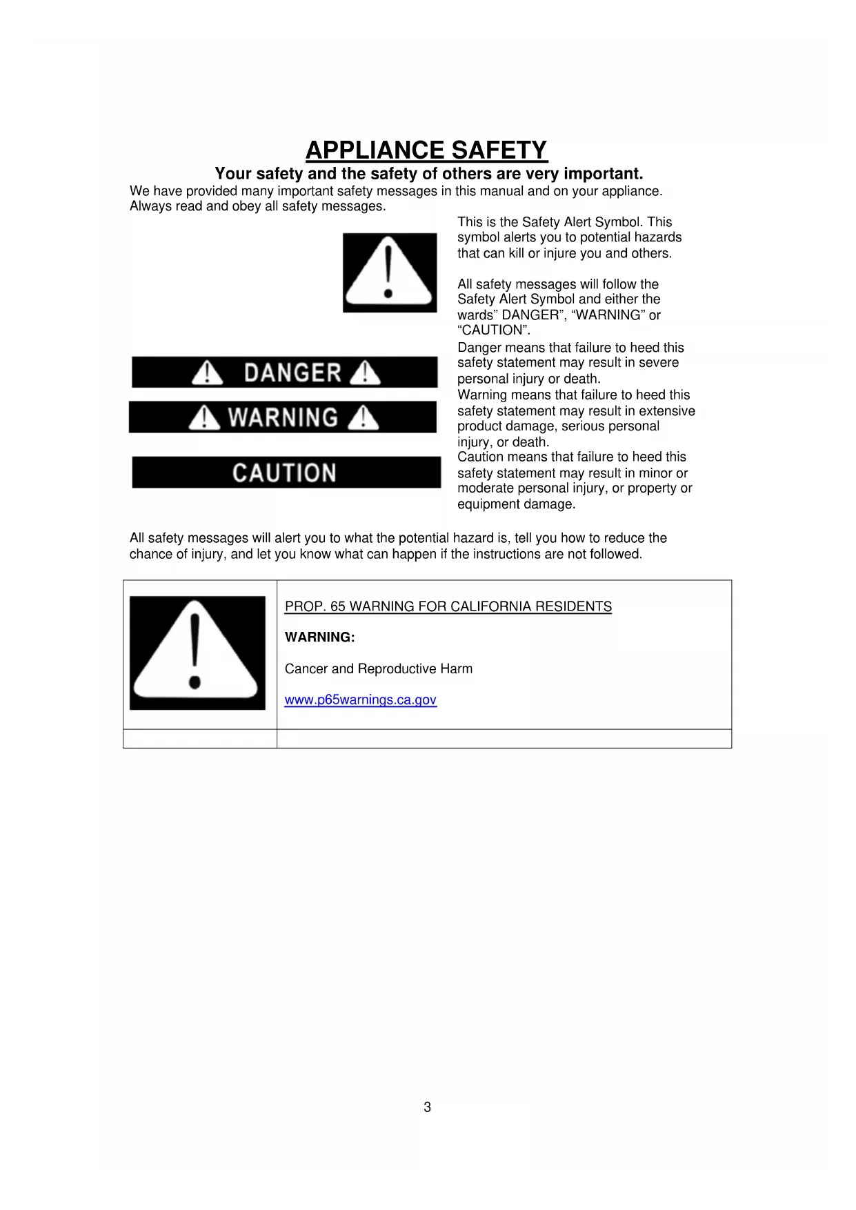 Last Page3 APPLIANCE SAFETY Your safety and the safety of others are very important. We have provided many important safety messages in this manual and on your appliance. Always read and obey all safety messages.