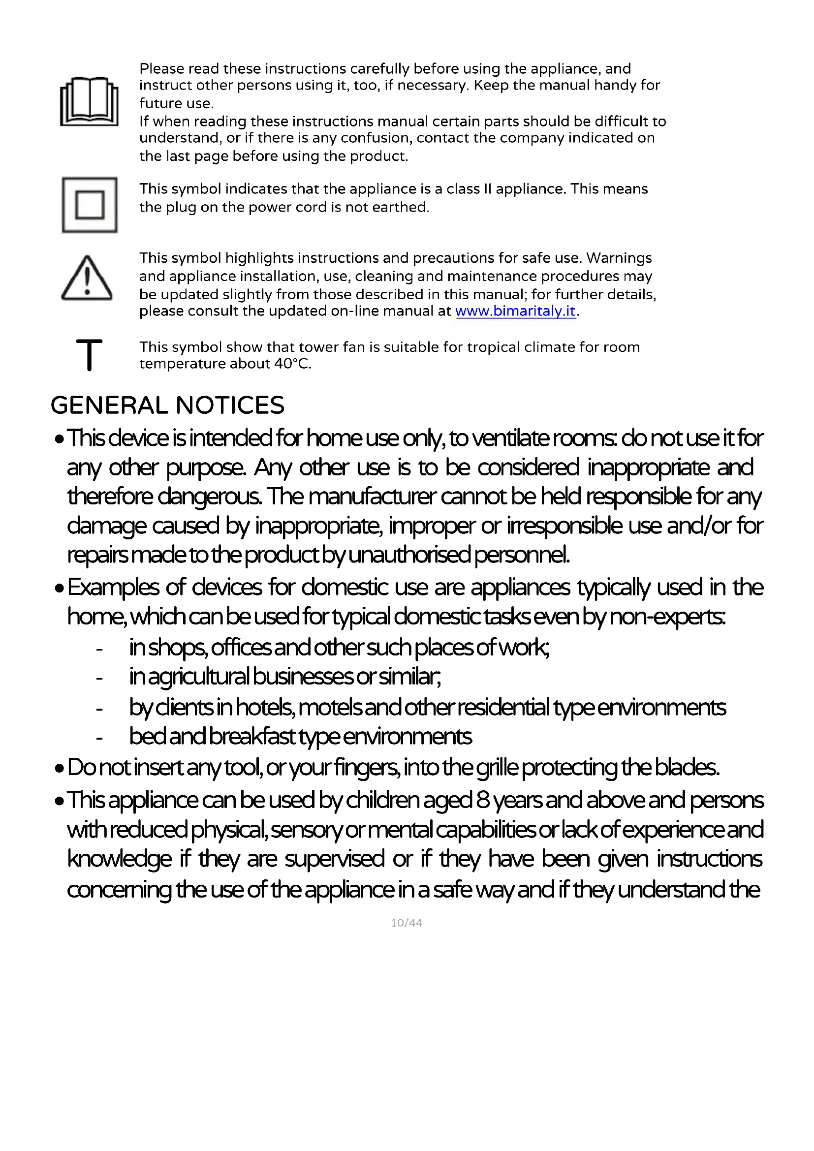 This symbol show that tower fan is suitable for tropical climate for room temperature about 40°C. GENERAL NOTICES