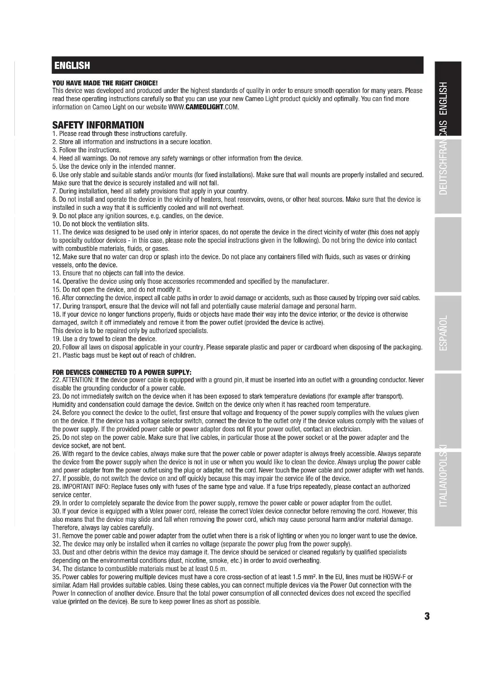 DEUTSCHFRANCAIS ESPAÑOL ENGLISH ITALIANO POLSKI ENGLISH YOU HAVE MADE THE RIGHT CHOICE! This device was developed and produced under the highest standards of quality in order to ensure smooth operation for many years. Please read these operating instructions carefully so that you can use your new Cameo Light product quickly and optimally. You can find more information on Cameo Light on our website WWW.CAMEOLIGHT.COM. SAFETY INFORMATION