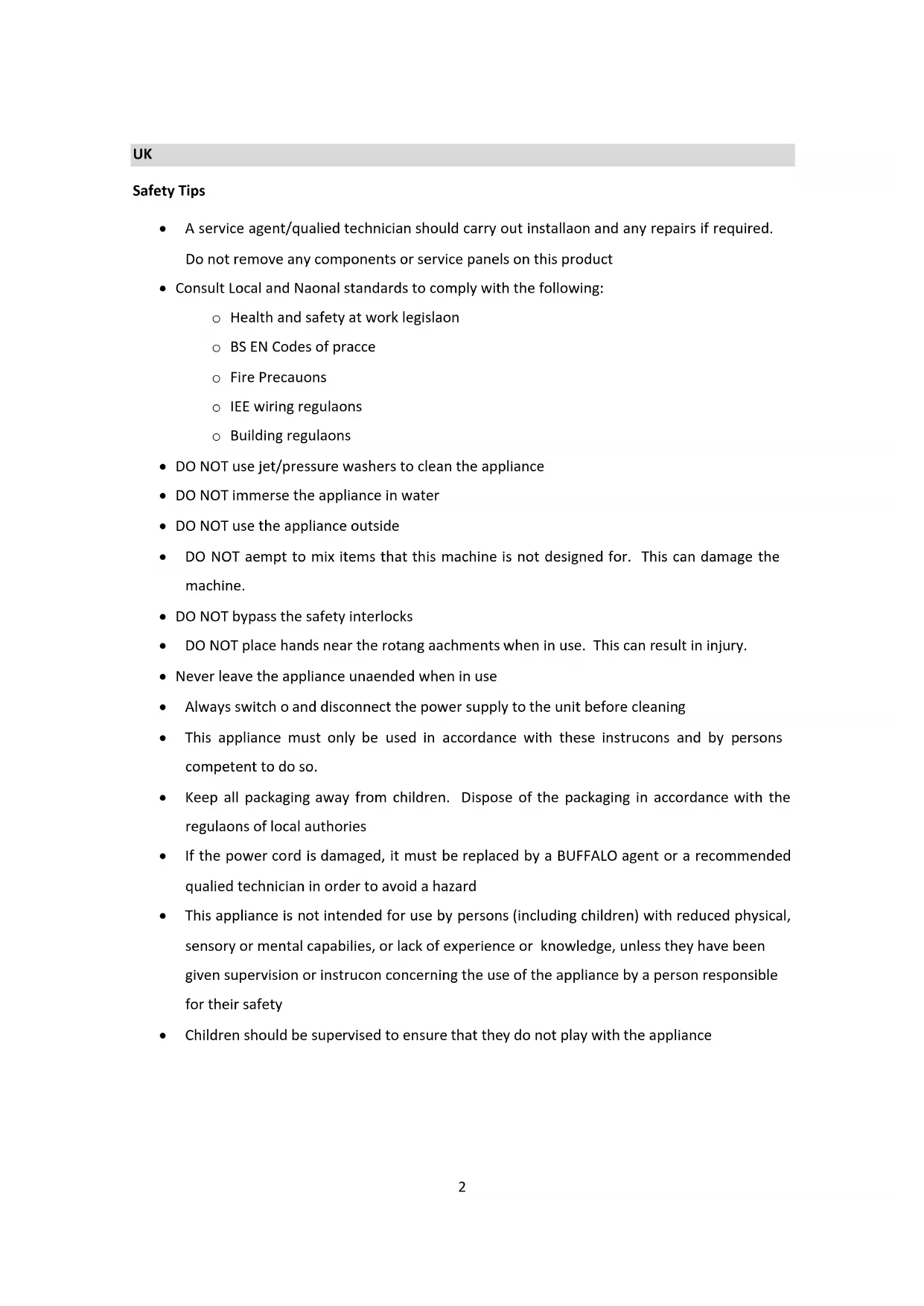 Safety Tips A service agent/qualified technician should carry out installation and any repairs if required. Do not remove any components or service panels on this product Consult Local and National standards to comply with the following: o Health and safety at work legislation o BS EN Codes of practice o Fire Precautions o IEE wiring regulations o Building regulations DO NOT use jet/pressure washers to clean the appliance DO NOT immerse the appliance in water DO NOT use the appliance outside DO NOT attempt to mix items that this machine is not designed for. This can damage the machine. DO NOT bypass the safety interlocks DO NOT place hands near the rotating attachments when in use. This can result in injury. Never leave the appliance unattended when in use Always switch off and disconnect the power supply to the unit before cleaning This appliance must only be used in accordance with these instructions and by persons competent to do so. Keep all packaging away from children. Dispose of the packaging in accordance with the regulations of local authorities If the power cord is damaged, it must be replaced by a BUFFALO agent or a recommended qualified technician in order to avoid a hazard This appliance is not intended for use by persons (including children) with reduced physical, sensory or mental capabilities, or lack of experience or knowledge, unless they have been given supervision or instruction concerning the use of the appliance by a person responsible for their safety Children should be supervised to ensure that they do not play with the appliance3 Telephone Helpline: 0845 146 2887 (United Kingdom) Product Description GJ464 – BUFFALO Planetary Mixer 7L Pack Contents BUFFALO Planetary Mixer Spiral Dough Hook Beater Whisk Mixing Bowl Splash Guard Instruction manual BUFFALO prides itself on quality and service, ensuring that at the time of packaging the contents are supplied fully functional and free of damage. Should you find any damage as a result of transit, please contact your BUFFALO dealer immediately. Installation Ensure the location of the Planetary Mixer is capable of supporting its weight
