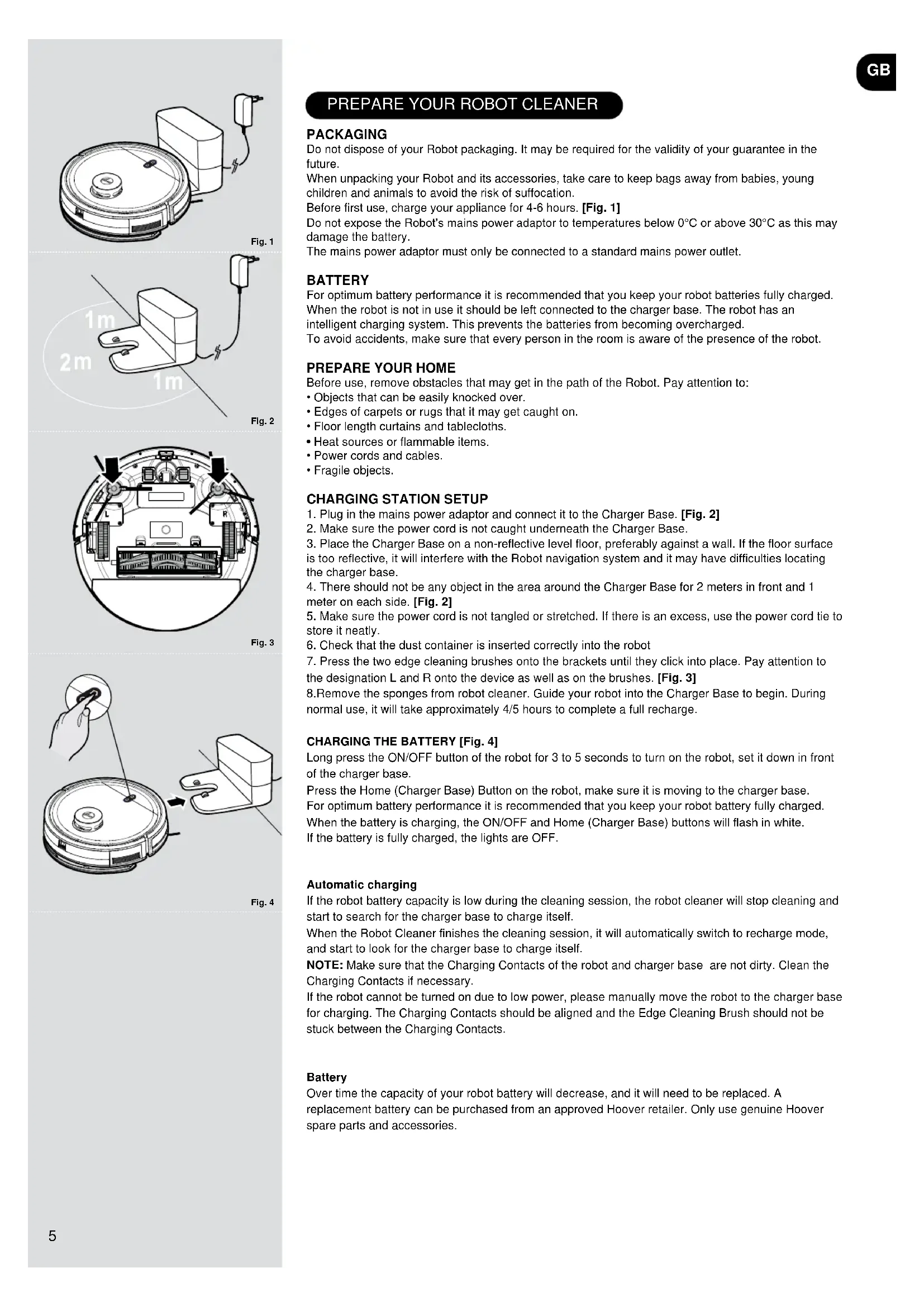the designation L and R onto the device as well as on the brushes. [Fig. 3] 8.Remove the sponges from robot cleaner. Guide your robot into the Charger Base to begin. During normal use, it will take approximately 4/5 hours to complete a full recharge. CHARGING THE BATTERY [Fig. 4] Long press the ON/OFF button of the robot for 3 to 5 seconds to turn on the robot, set it down in front of the charger base. Press the Home (Charger Base) Button on the robot, make sure it is moving to the charger base. For optimum battery performance it is recommended that you keep your robot battery fully charged. When the battery is charging, the ON/OFF and Home (Charger Base) buttons will ash in white. If the battery is fully charged, the lights are OFF. Automatic charging If the robot battery capacity is low during the cleaning session, the robot cleaner will stop cleaning and start to search for the charger base to charge itself. When the Robot Cleaner nishes the cleaning session, it will automatically switch to recharge mode, and start to look for the charger base to charge itself. NOTE: Make sure that the Charging Contacts of the robot and charger base are not dirty. Clean the Charging Contacts if necessary. If the robot cannot be turned on due to low power, please manually move the robot to the charger base for charging. The Charging Contacts should be aligned and the Edge Cleaning Brush should not be stuck between the Charging Contacts. Battery Over time the capacity of your robot battery will decrease, and it will need to be replaced. A replacement battery can be purchased from an approved Hoover retailer. Only use genuine Hoover spare parts and accessories. Fig. 4 GB6