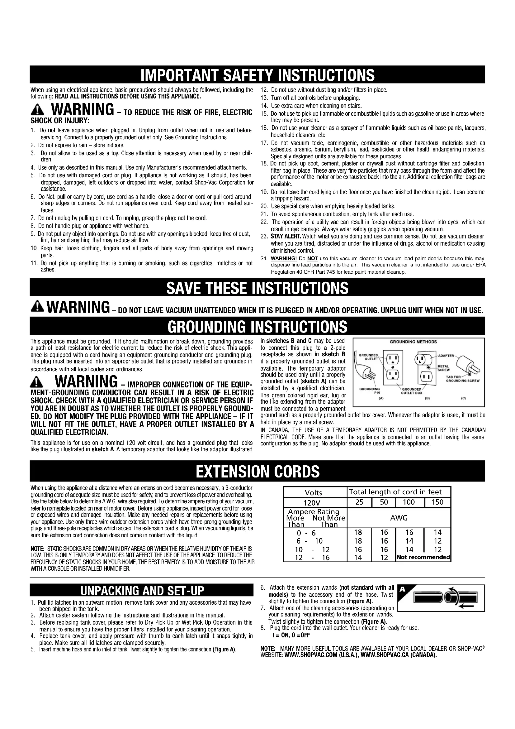 dren.4. Use only as described in this manual. Use only Manufacturer’s recommended attachments.5. Do not use with damaged cord or plug. If appliance is not working as it should, has been dropped, damaged, left outdoors or dropped into water, contact Shop-Vac Corporation for assistance.6. Do Not: pull or carry by cord, use cord as a handle, close a door on cord or pull cord around sharp edges or corners. Do not run appliance over cord. Keep cord away from heated sur-faces.7. Do not unplug by pulling on cord. To unplug, grasp the plug: not the cord.8. Do not handle plug or appliance with wet hands.9. Do not put any object into openings. Do not use with any openings blocked; keep free of dust, lint, hair and anything that may reduce air flow.10. Keep hair, loose clothing, fingers and all parts of body away from openings and moving parts.11. Do not pick up anything that is burning or smoking, such as cigarettes, matches or hot ashes.12. Do not use without dust bag and/or filters in place.13. Turn off all controls before unplugging.14. Use extra care when cleaning on stairs.15. Do not use to pick up flammable or combustible liquids such as gasoline or use in areas where they may be present.16. Do not use your cleaner as a sprayer of flammable liquids such as oil base paints, lacquers, household cleaners, etc.17. Do not vacuum toxic, carcinogenic, combustible or other hazardous materials such as asbestos, arsenic, barium, beryllium, lead, pesticides or other health endangering materials. Specially designed units are available for these purposes.18. Do not pick up soot, cement, plaster or drywall dust without cartridge filter and collection filter bag in place. These are very fine particles that may pass through the foam and affect the performance of the motor or be exhausted back into the air. Additional collection filter bags are available.19. Do not leave the cord lying on the floor once you have finished the cleaning job. It can become a tripping hazard.20. Use special care when emptying heavily loaded tanks.21. To avoid spontaneous combustion, empty tank after each use.22. The operation of a utility vac can result in foreign objects being blown into eyes, which can result in eye damage. Always wear safety goggles when operating vacuum.