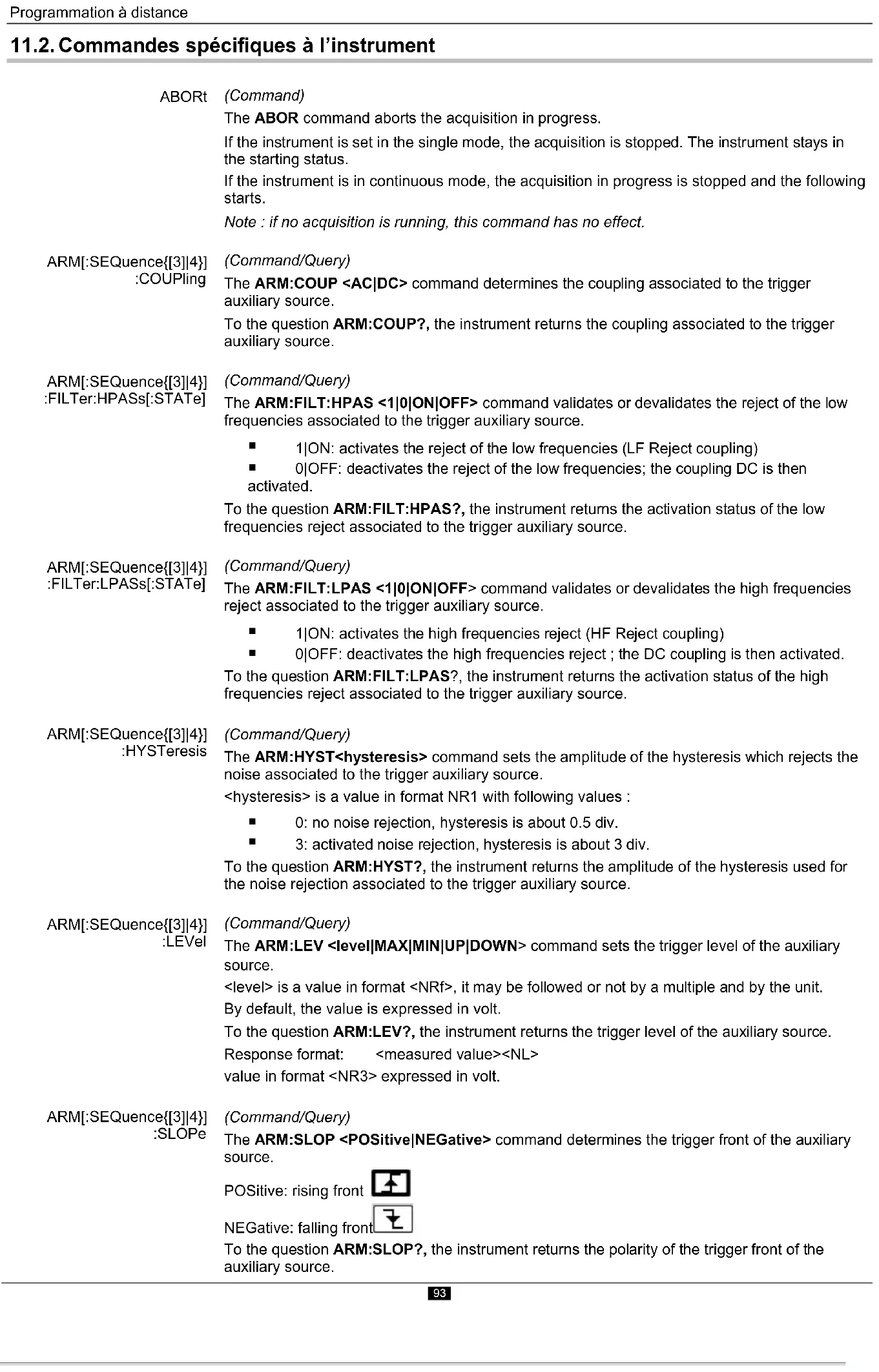 ARM[:SEQuence{[3]|4}] :SLOPe (Command/Query) The ARM:SLOP <POSitive|NEGative> command determines the trigger front of the auxiliary source. POSitive: rising front NEGative: falling front To the question ARM:SLOP?, the instrument returns the polarity of the trigger front of the auxiliary source.Programmation à distance