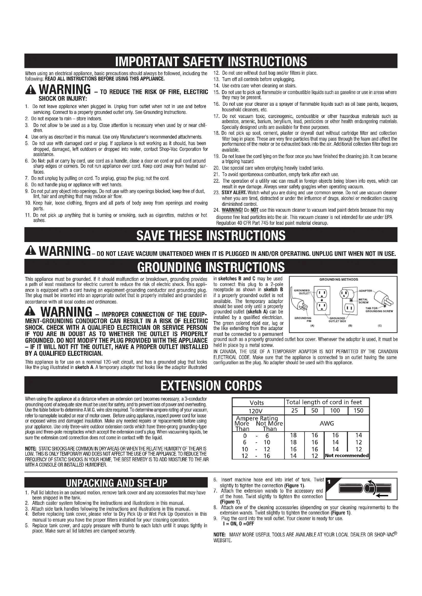 manual to ensure you have the proper filters installed for your cleaning operation.5. Replace tank cover, and apply pressure with thumb to each latch until it snaps tightly in place. Make sure all lid latches are clamped securely. When using the appliance at a distance where an extension cord becomes necessary, a 3-conductor grounding cord of adequate size must be used for safety, and to prevent loss of power and overheating. Use the table below to determine A.W.G. wire size required. To determine ampere rating of your vacuum, refer to nameplate located on rear of motor cover. Before using appliance, inspect power cord for loose or exposed wires and damaged insulation. Make any needed repairs or replacements before using your appliance. Use only three-wire outdoor extension cords which have three-prong grounding-type plugs and three-pole receptacles which accept the extension cord’s plug. When vacuuming liquids, be sure the extension cord connection does not come in contact with the liquid. NOTE: STATIC SHOCKS ARE COMMON IN DRY AREAS OR WHEN THE RELATIVE HUMIDITY OF THE AIR IS LOW. THIS IS ONLY TEMPORARY AND DOES NOT AFFECT THE USE OF THE APPLIANCE. TO REDUCE THE FREQUENCY OF STATIC SHOCKS IN YOUR HOME, THE BEST REMEDY IS TO ADD MOISTURE TO THE AIR WITH A CONSOLE OR INSTALLED HUMIDIFIER. EXTENSION CORDS When using an electrical appliance, basic precautions should always be followed, including the following: READ ALL INSTRUCTIONS BEFORE USING THIS APPLIANCE. WARNING – TO REDUCE THE RISK OF FIRE, ELECTRIC SHOCK OR INJURY: 1. Do not leave appliance when plugged in. Unplug from outlet when not in use and before servicing. Connect to a properly grounded outlet only. See Grounding Instructions.2. Do not expose to rain – store indoors.
