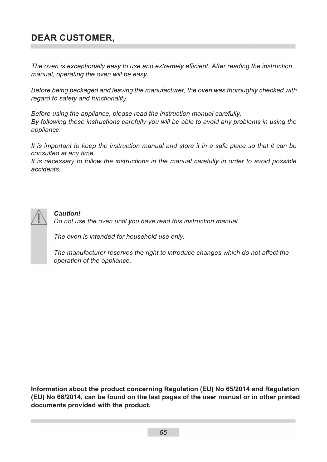 replacing the lamp to avoid the possibillity of electric shock. You should not use steam cleaning devices to clean the appliance.67 SAFETY INSTRUCTIONS ● Ensure that small items of household equipment, including connection leads, do not touch the hot oven as the insulation material of this equipment is usually not resistant to high temperatures. ● Do not leave the oven unattended when frying. Oils and fats may catch re due to overheating or boiling over. ● Do not put pans weighing over 15 kg on the opened door of the oven. ● Do not use harsh cleaning agents or sharp metal objects to clean the door as they can scratch the surface, which could then result in the glass cracking. ● Do not use the oven in the event of a technical fault. Any faults must be xed by an appropriately qualied and authorised person. ● In the event of any incident caused by a technical fault, disconnect the power and report the fault to the service centre to be repaired. ● The rules and provisions contained in this instruction manual should be strictly observed. Do not allow anybody who is not familiar with the contents of this instruc- tion manual to operate the oven. ● The appliance has been designed only for cooking. Any other use (for example for heating) does not comply with its operating prole and may cause danger. Danger of burns! Hot steam may escape when you open the oven door. Be careful when you open the oven door during or after cooking. Do NOT lean over the door when you open it. Please note that depending on the temperature the steam can be invisible.68