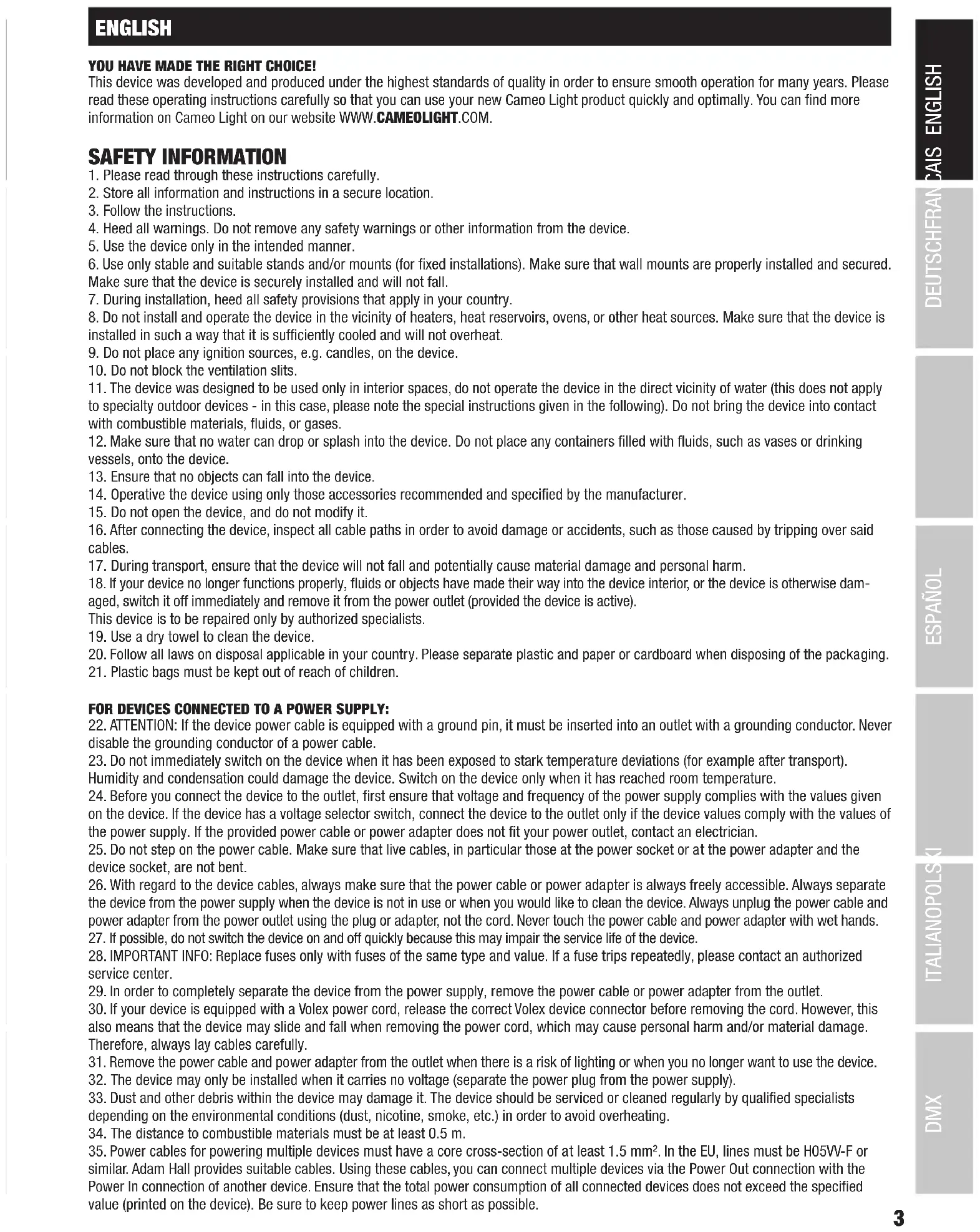 CONTROLLO DMX 633 DMX DEUTSCHFRANCAIS ESPAÑOL ENGLISH ITALIANO POLSKI ENGLISH YOU HAVE MADE THE RIGHT CHOICE! This device was developed and produced under the highest standards of quality in order to ensure smooth operation for many years. Please read these operating instructions carefully so that you can use your new Cameo Light product quickly and optimally. You can find more information on Cameo Light on our website WWW.CAMEOLIGHT.COM. SAFETY INFORMATION