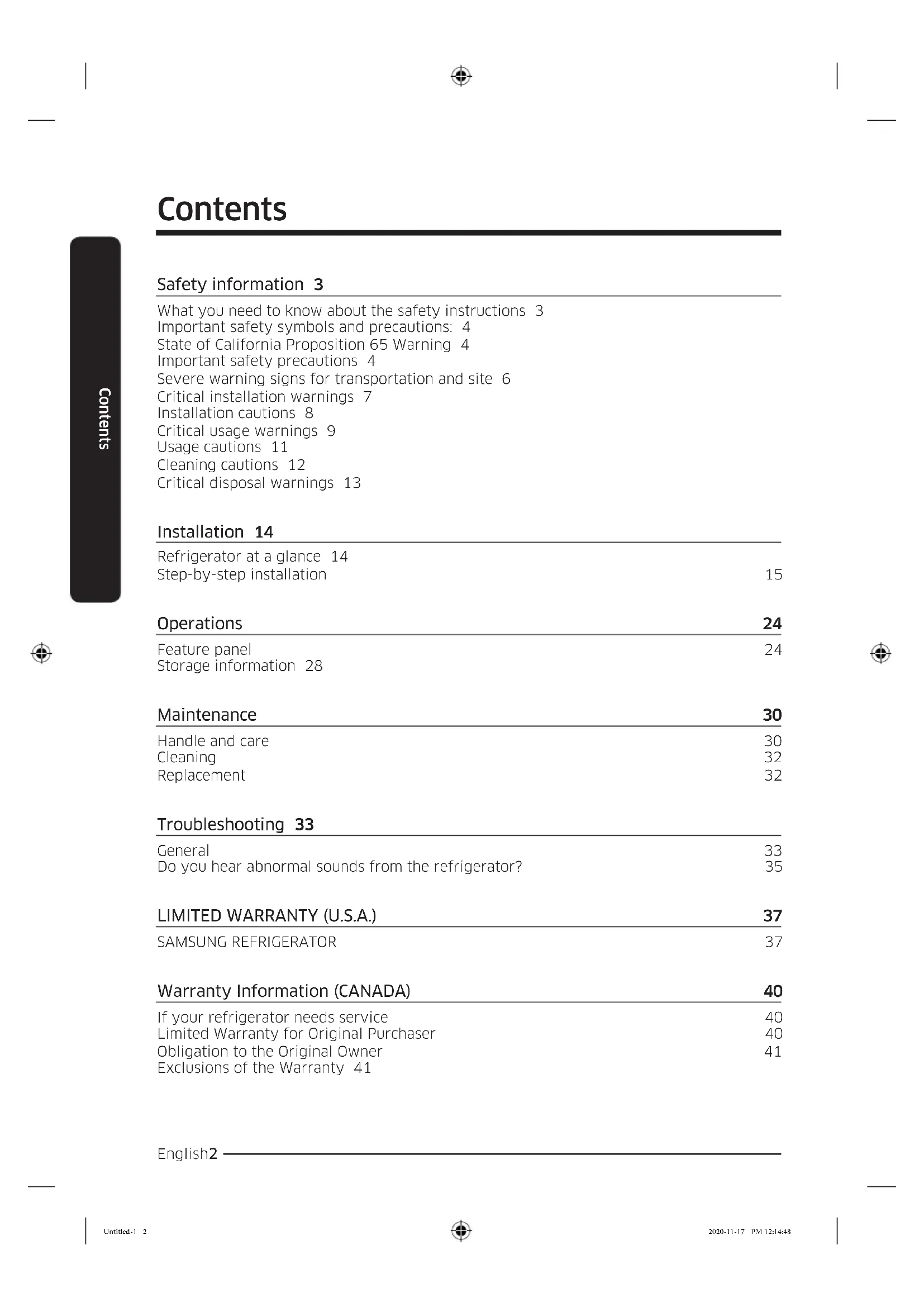 SAMSUNG REFRIGERATOR 37 Warranty Information (CANADA) 40 If your refrigerator needs service 40 Limited Warranty for Original Purchaser 40 Obligation to the Original Owner 41 Exclusions of the Warranty 41 Untitled-1 2 2020-11-17 PM 12:14:48English 3 Safety information Before using your new Samsung Refrigerator, please read this manual thoroughly to ensure that you know how to operate the features and functions that your new appliance offers safely and efciently. What you need to know about the safety instructions