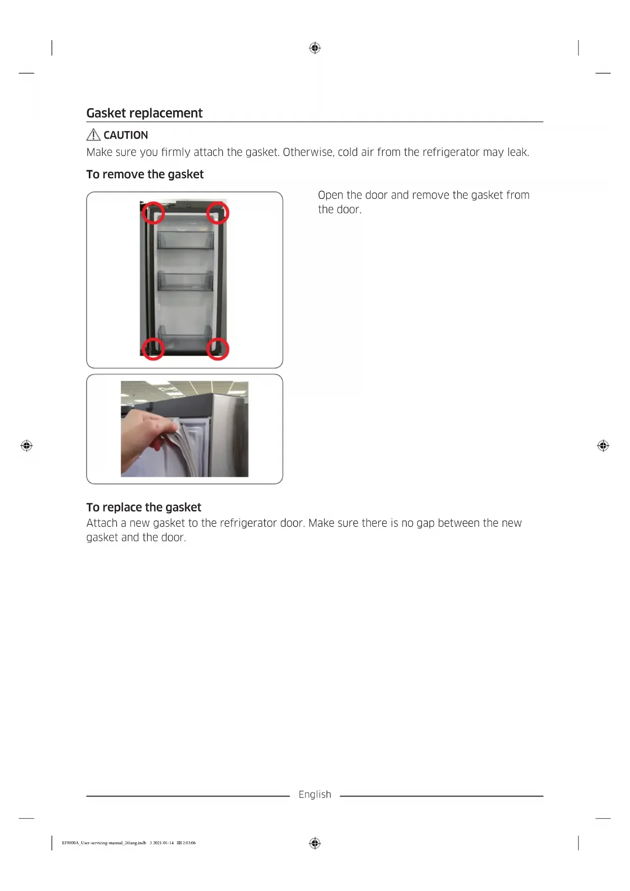 01 Top hinge 02 Gasket 03 Hinge Mid 04 Drawer 05 Hinge Low 06 Barcode label RF9000A_User-servicing-manual_26lang.indb 2 2021-01-14 2:03:06English Gasket replacement CAUTION Make sure you rmly attach the gasket. Otherwise, cold air from the refrigerator may leak. To remove the gasket Open the door and remove the gasket from the door. To replace the gasket Attach a new gasket to the refrigerator door. Make sure there is no gap between the new gasket and the door. RF9000A_User-servicing-manual_26lang.indb 3 2021-01-14 2:03:06English Drawer replacement CAUTION Check that the drawer is inserted properly into the rail during assembly. To remove the drawers Gently lift up the front of the drawer and slide out.