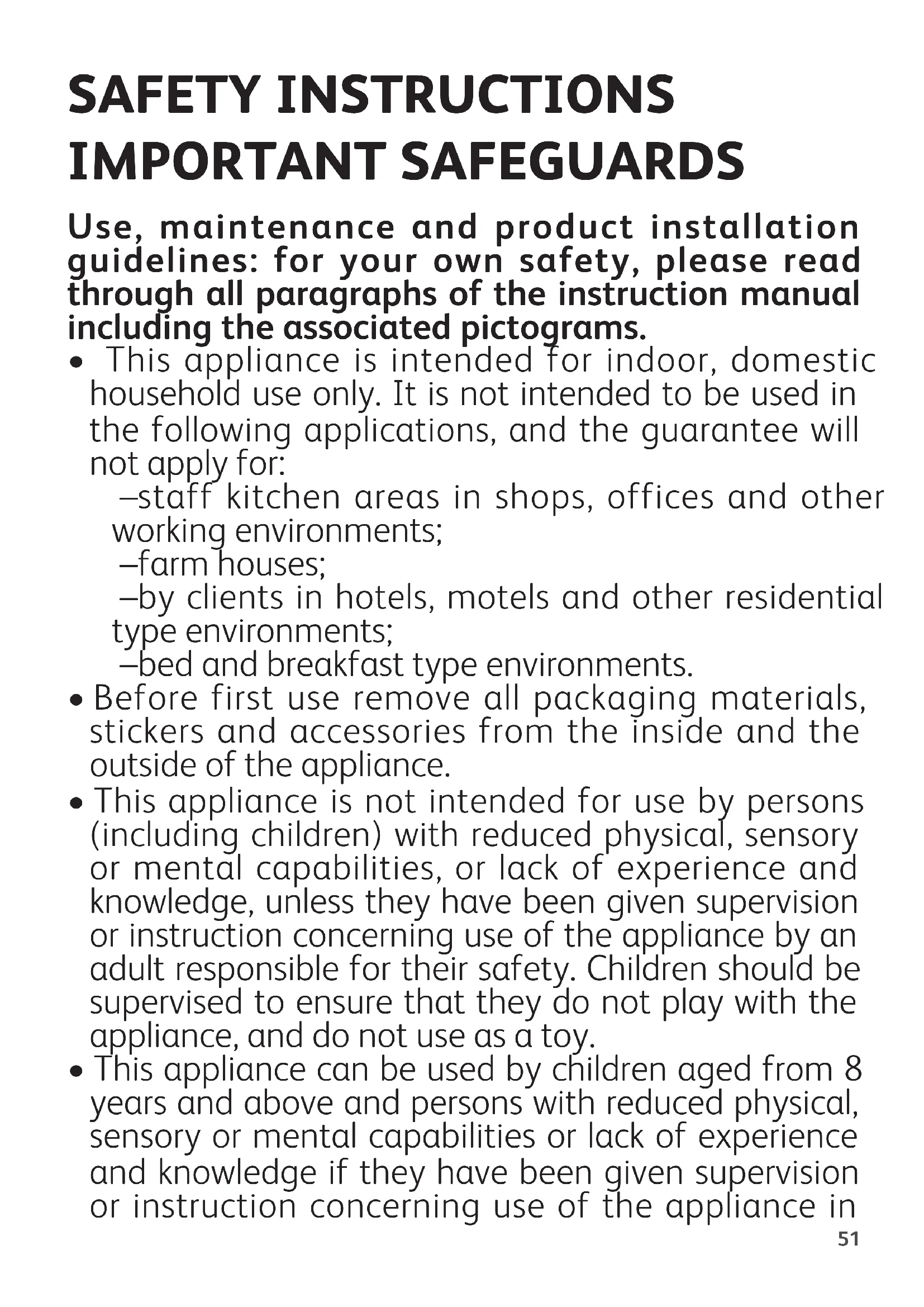 - COOKING GUIDE (INCLUDING MANUAL MODE) p.6551 SAFETY INSTRUCTIONS IMPORTANT SAFEGUARDS Use, maintenance and product installation guidelines: for your own safety, please read through all paragraphs of the instruction manual including the associated pictograms.