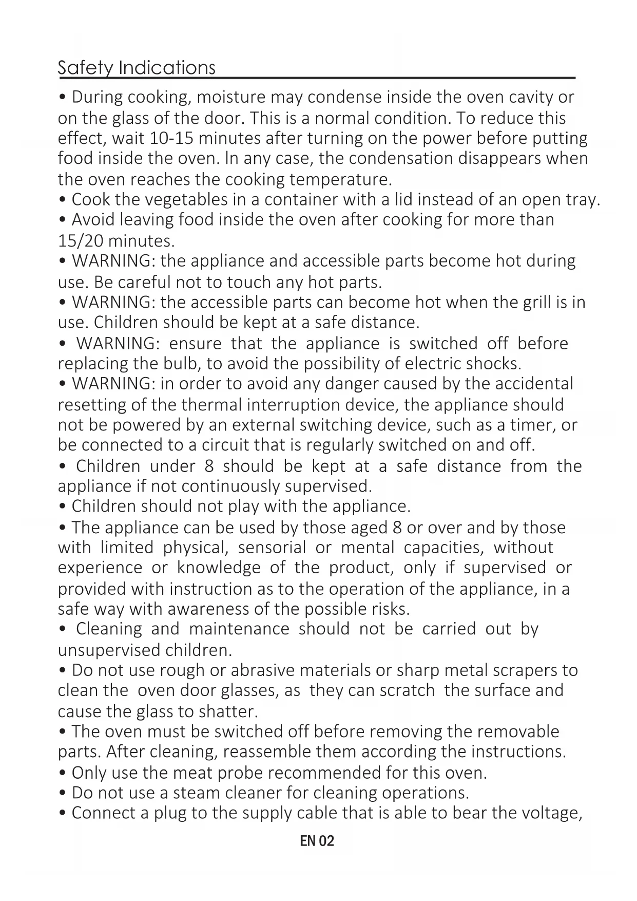 - During the pyrolytic cleaning process, surfaces can heat up more than usual, children must therefore be kept at a safe distance. EN 04Summary EN 05 General Instructions
