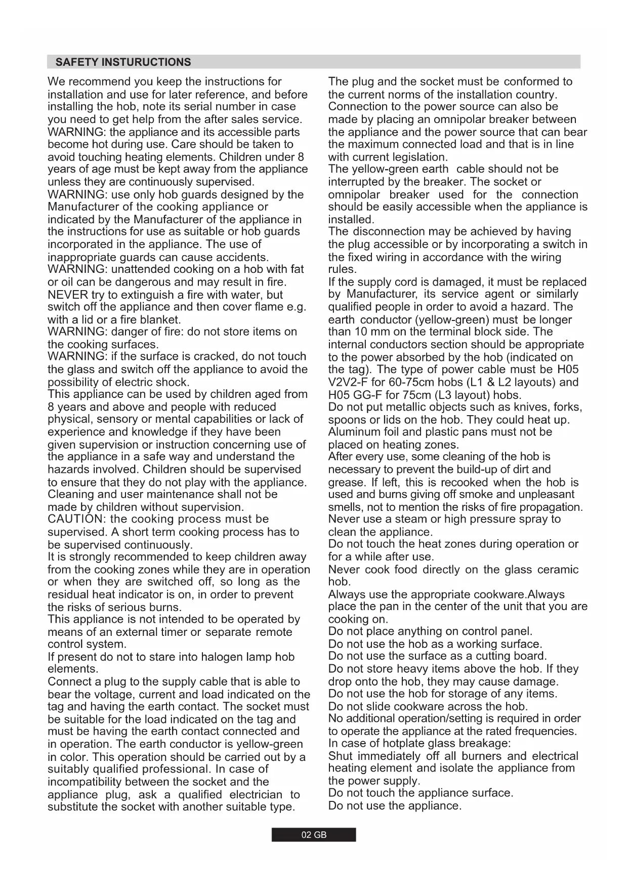 Warning - this appliance must be earthed This appliance is designed for domestic use only. Connection to the main supply must be made by a competant electrician, ensuring that all current regulations concerning such installations are observed.The appliance must only be connected to a suitably rated spur point, a3 pin 13 amp plug/socket is not suitable. Adouble pole switch must beprovided and the circuit must have appropriate fuse protection. Further details of the power requirement of the individual product will be found in the users’ instruction and on the appliance rating plate. In the case of built-in product you are advised, should you wish to use a longer cable than the one supplied, that a suitably rated heat resistanttype must be used.The wiring must be connected to the mains supply as follows:CONNECT TO SPUR TERMINALGreen & Yellow Wire Earth ConnectionBlue Wire Neutral ConnectionBrown Wire Live Connection Note: We do not advocate the use of earth leakage devices with electric cooking appliances installed to spur points because of the «nuisance tripping» which may occur. You are again reminded that the appliance must be correctly earthed, the manufacturer declines any responsibility for any event occurring as a result of incorrect electricalinstallation. 2.1. ELECTRICAL CONNECTION Check the data on the rating plate, located on the outside of the unit, to ensure that the supply and input voltage are suitable.Before connection, check the earthing system.By Law, this appliance must be earthed. If this regulation is not compliedwith, the Manufacturer will not be responsible for any damage caused topersons or property. If a plug is not already attached, fit a plug appropriate to the load indicated on the rating plate. The earth wire is coloured yellow/green. The plug should always be accessible. Where the Hob is connected direct to the electricity supply, a circuit breaker must be fitted.If the power supply cord is damaged this is to be replaced by a qualifiedengineer so as to prevent any potential risk.The earth wire ( green and yellow coloured ) must be at least 10 mmlonger than the live and neutral wires. The section of the cable used must be of the correct size in relation to the absorbed power of the hob. Please check rating plate for the power details and ensure that the power supply cord is of the type 3x0.75 mm² H05 V2V2-F for 60-75cm hobs (L1 & L2 layouts) and H05 GG-F for 75cm (L3 layout) hobs. LIVE EARTHNEUTRAL