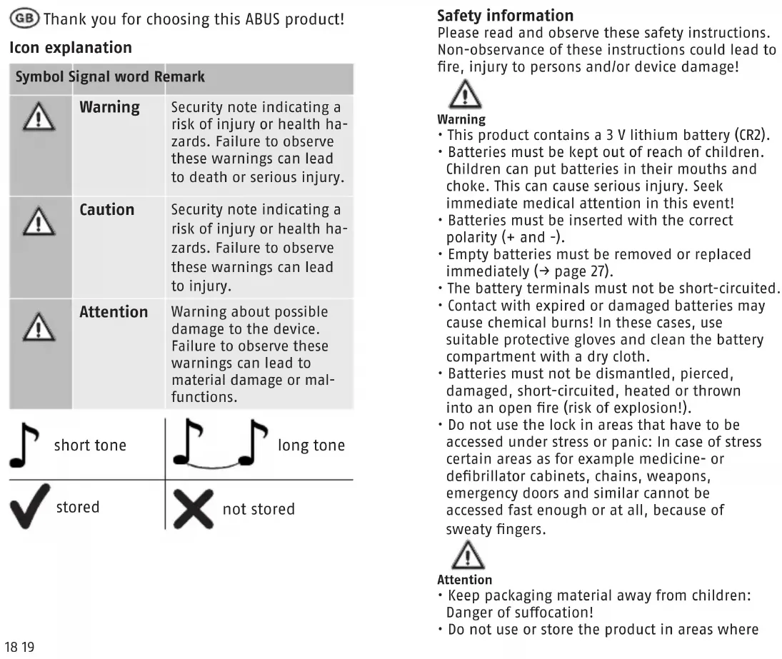 57 is in compliance with the Electromagnetic Compatibility Regulations 2016 and the Restriction of the Use of Certain Hazardous Substances in Electrical and Electronic Equipment Regulations 2012. The full text of the UK declaration WEEE-Reg.-Nr. DE79663011 of conformity can be requested at: info@abus.de Disposal It is your responsibility to delete all stored personal data prior to disposal of the product. This product contains valuable raw materials. At the end of its service life, dispose of the product in accordance with the applicable legal require- ments. Electrical appliances, rechargeable batteries and batteries must not be disposed of with household waste. Disposal must be carried out in accordance with Directive 2012/19/EU on waste electrical and electronic equipment (WEEE), or Directive 2006/66/ EC on batteries and accumulators and waste batteries and accumulators. Batteries must be removed from electrical appliances and disposed of separately before disposal. Dispose of the packaging according to type. Sepa- rate the cardboard, foil and plastic elements for recycling. Please contact the local authority responsible for disposal if you have any queries. You can obtain information on collection points for your old appliances, for example, from the local municipal or city administration, the local waste disposal companies, or your specialist dealer. Warranty ABUS products are designed, manufactured and tested in accordance with applicable regulations with great care. The warranty exclusively covers faults that are caused by material or manufacturing defects. If a material or manufacturing defect28 29 Merci d’avoir choisi ce produit ABUS ! Explication des symbols Symbole Mot-signal Observation Avertisse- ment Consigne de sécurité relative aux risques de blessure ou de danger pour votre santé. Le non-respect de ces con- signes peut entraîner un danger de mort ou des blessures graves. Prudence Consigne de sécurité relative aux risques de blessure ou de danger pour votre santé. Le non-respect de ces con- signes peut entraîner des blessures. Attention Avertissement con- cernant d’éventuels endommagements de l’appareil. Le non respect de ces consignes peut entraîner des dommages matériels ou des dysfon- ctionnements. can be proven, the product will be repaired or replaced at the discretion of the warrantor. In such cases, the warranty ends with the termination of the original warranty period. Any further claims are expressly excluded. ABUS assumes no liability for defects or damage that has been caused by external inuences (e.g. transport, external forces), improper use, normal wear and tear or non- compliance with this operating and installation instructions document. If a warranty claim is asserted, the product must be returned with the original receipt with date of purchase and a brief written description of the fault. No liability for mistakes and printing errors. bip court bip long enregistrée non enregistrée30 31 Consignes de sécurité Veuillez lire ces consignes de sécurité et les respec- ter. Leur non-respect peut conduire à un incendie et/ou des dommages matériels et corporels !