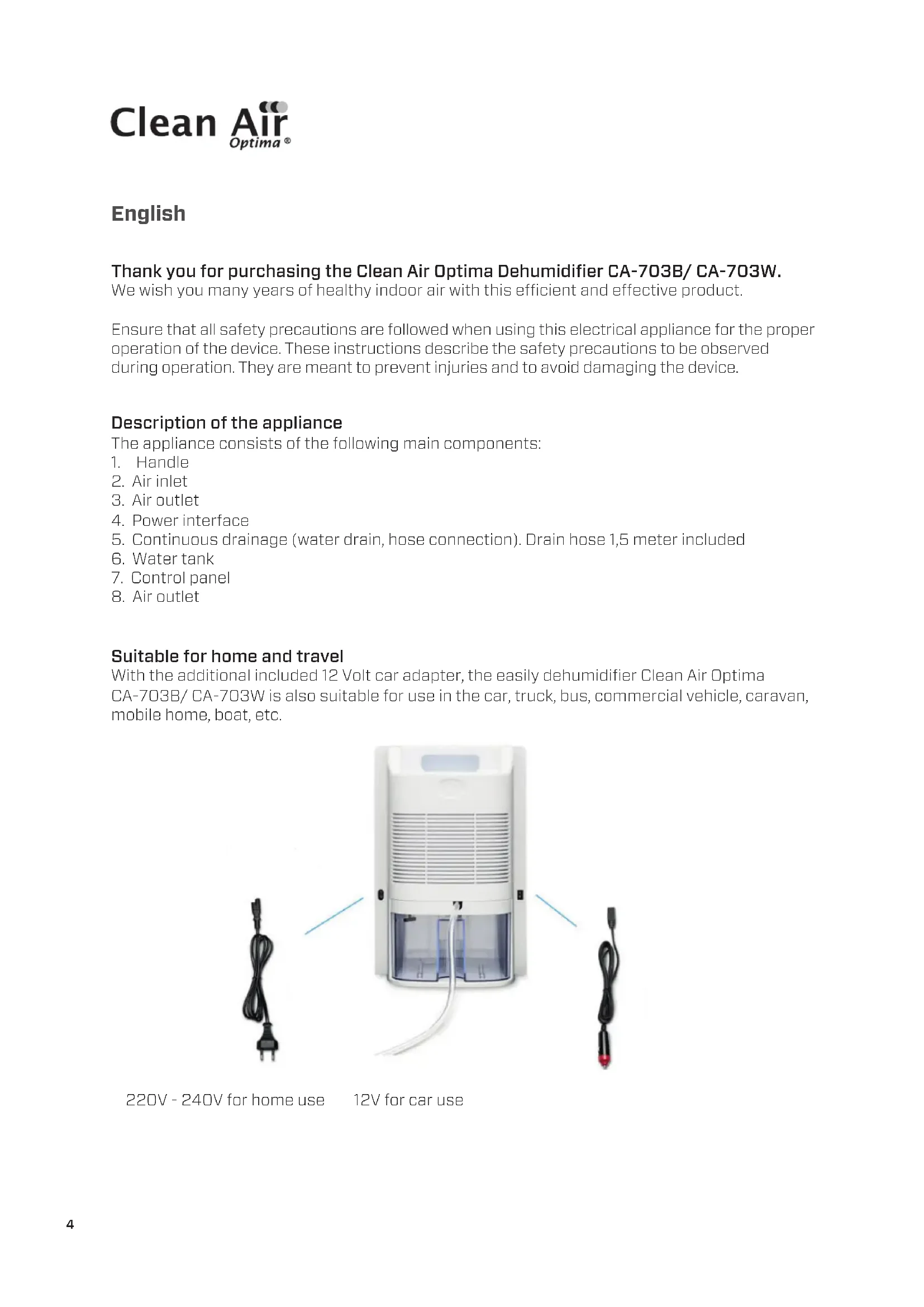 Suitable for home and travel With the additional included 12 Volt car adapter, the easily dehumidifier Clean Air Optima CA-703B/ CA-703W is also suitable for use in the car, truck, bus, commercial vehicle, caravan, mobile home, boat, etc. 220V - 240V for home use 12V for car use5 Safety warnings This device may only be used in accordance with this safety instructions. Take the following steps to minimize the risk of personal injury caused by for example electric shocks or fire.