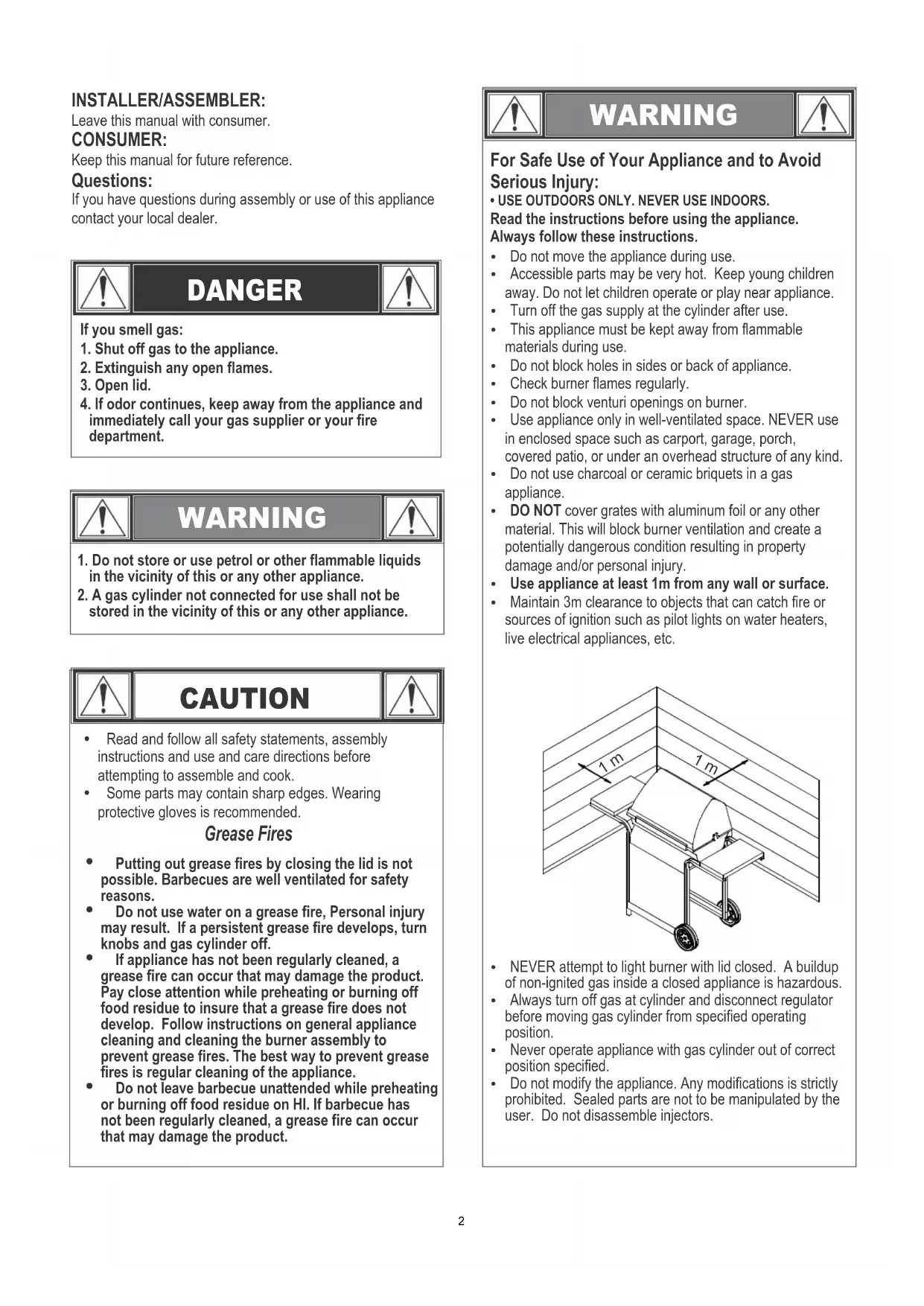 468212020INSTALLER/ASSEMBLER: Leave this manual with consumer. CONSUMER: Keep this manual for future reference. Questions: If you have questions during assembly or use of this appliance contact your local dealer. DANGER WARNING If you smell gas:1. Shut off gas to the appliance.2. Extinguish any open flames.3. Open lid.4. If odor continues, keep away from the appliance andimmediately call your gas supplier or your firedepartment.1. Do not store or use petrol or other flammable liquidsin the vicinity of this or any other appliance.2. A gas cylinder not connected for use shall not bestored in the vicinity of this or any other appliance. CAUTION Ÿ Read and follow all safety statements, assemblyinstructions and use and care directions beforeattempting to assemble and cook.Ÿ Some parts may contain sharp edges. Wearingprotective gloves is recommended. Grease Fires Ÿ Putting out grease fires by closing the lid is not possible. Barbecues are well ventilated for safetyreasons. Ÿ Do not use water on a grease fire, Personal injury may result. If a persistent grease fire develops, turnknobs and gas cylinder off. Ÿ If appliance has not been regularly cleaned, a grease fire can occur that may damage the product.Pay close attention while preheating or burning offfood residue to insure that a grease fire does notdevelop. Follow instructions on general appliancecleaning and cleaning the burner assembly toprevent grease fires. The best way to prevent greasefires is regular cleaning of the appliance. Ÿ Do not leave barbecue unattended while preheating or burning off food residue on HI. If barbecue hasnot been regularly cleaned, a grease fire can occurthat may damage the product. WARNING For Safe Use of Your Appliance and to Avoid Serious Injury: