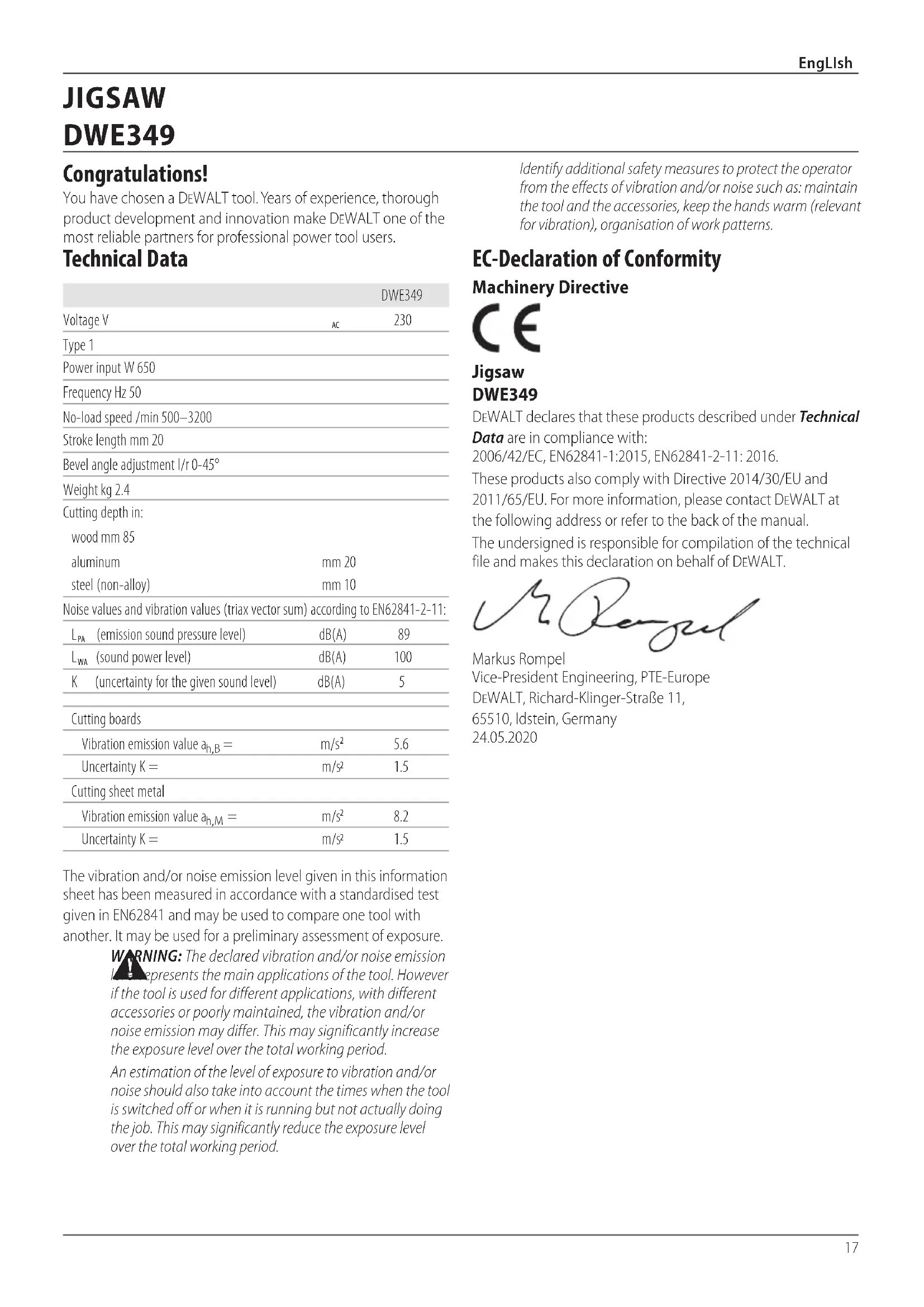 THE SUPPLY OF MACHINERY (SAFETY) REGULATIONS 2008 Jigsaw DWE349 DeWALT declares that these products described under “technical data” are in compliance with: The Supply of Machinery (Safety) Regulations, 2008, S.I. 2008/1597 (as amended, EN62841‑1:2015, EN62841‑2‑11:2016. These products conform to the following UK Regulations: Electromagnetic Compatibility Regulations, 2016, S.I.2016/1091 (as amended). The Restriction of the Use of Certain Hazardous Substances in Electrical and Electronic Equipment Regulations 2012, S.I. 2012/3032 (as amended). For more information, please contact DeWALT at the following address or refer to the back of the manual. The undersigned is responsible for compilation of the technical file and makes this declaration on behalf of DeWALT. Karl Evans Vice President Professional Power Tools EANZ GTS 270 Bath Road, Slough SL1 4DX England