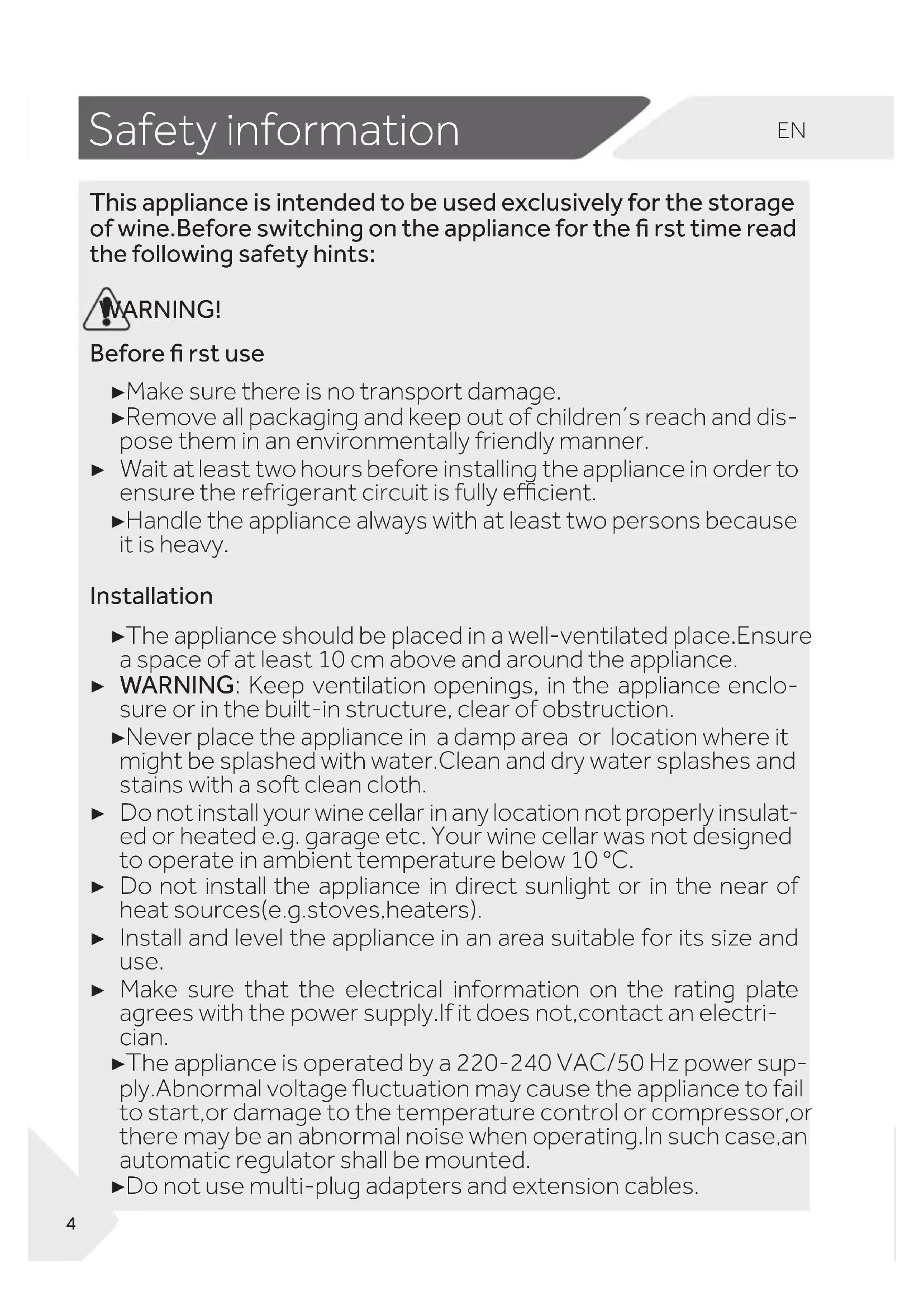 This appliance is intended to be used exclusively for the storage of wine.Before switching on the appliance for the fi rst time read the following safety hints: WARNING! Before fi rst use ▶ Make sure there is no transport damage. ▶ Remove all packaging and keep out of children´s reach and dis- pose them in an environmentally friendly manner. ▶ Wait at least two hours before installing the appliance in order to ensure the refrigerant circuit is fully ecient. ▶ Handle the appliance always with at least two persons because it is heavy. Installation ▶ The appliance should be placed in a well-ventilated place.Ensure a space of at least 10 cm above and around the appliance. ▶ WARNING: Keep ventilation openings, in the appliance enclo- sure or in the built-in structure, clear of obstruction. ▶ Never place the appliance in a damp area or location where it might be splashed with water.Clean and dry water splashes and stains with a soft clean cloth. ▶ Do not install your wine cellar in any location not properly insulat- ed or heated e.g. garage etc. Your wine cellar was not designed to operate in ambient temperature below 10 °C. ▶ Do not install the appliance in direct sunlight or in the near of heat sources(e.g.stoves,heaters). ▶ Install and level the appliance in an area suitable for its size and use. ▶ Make sure that the electrical information on the rating plate agrees with the power supply.If it does not,contact an electri- cian. ▶ The appliance is operated by a 220-240 VAC/50 Hz power sup- ply.Abnormal voltage uctuation may cause the appliance to fail to start,or damage to the temperature control or compressor,or there may be an abnormal noise when operating.In such case,an automatic regulator shall be mounted. ▶ Do not use multi-plug adapters and extension cables. 4EN Safety information WARNING! ▶ WARNING: Do not locate multiple portable socket outlets or portable power supplies at the rear of the appliance. ▶ WARNING: When positioning the appliance, ensure the supply cord is not trapped or damaged. ▶ Do not step on the power cable. ▶ Use a separate earthed socket for the power supply which is easy accessible. The appliance must be earthed. ▶ Only for UK: The appliance´s power cable is tted with 3-cord (grounding) plug that ts a standard 3-cord (grounded) socket. Never cut o or dismount the third pin (grounding). After the appliance is installed, the plug should be accesible. ▶ WARNING: Do not damage the refrigerant circuit. Daily use ▶ This appliance can be used by children aged from 8 years and above and persons with reduced physical, sensory or mental capabilities or lack of experience and knowledge if they have been given supervision or instruction concerning use of the ap- pliance in a safe way and understand the hazards involved. ▶ Children shall not play with the appliance. ▶ Children aged from 3 to 8 years are allowed to load and unload refrigerating appliances, but not allowed to clean and install the refrigerating appliances. ▶ Keep away children under 3 years of age from the appliance un- less they are constantly supervised. ▶ Cleaning and user maintenance shall not be made by children with out supervision. ▶ The appliance must be positioned so that the plug is accessible. ▶ If coal gas or other inammable gas is leaking into vicinity of the appliance,turn o the valve of the leaking gas, open the doors and windows and do not unplug the power cable of the appliance . ▶ Wait at least 7 minutes to reconnect the power after the power has been disconnected. ▶ Do not lift the appliance by its door handles. ▶ The keys must be kept out of the reach of children and not in the vicinity of the appliance to prevent children from being locked in- side the appliance. 5Safety information