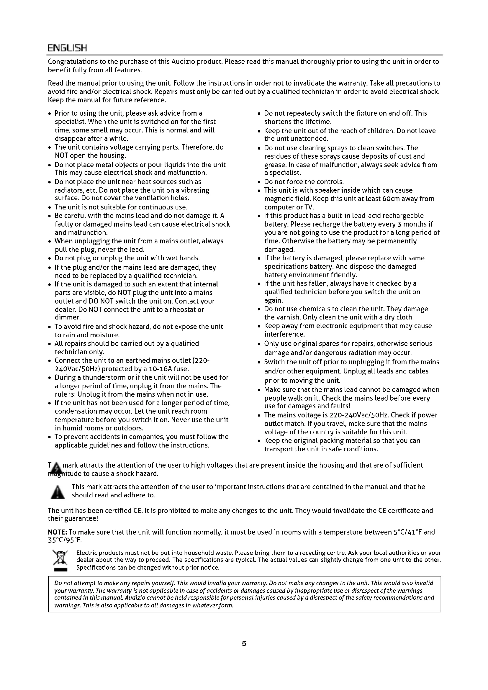 - Keep the original packing material so that you can transport the unit in safe conditions. This mark attracts the attention of the user to high voltages that are present inside the housing and that are of sufficient magnitude to cause a shock hazard. This mark attracts the attention of the user to important instructions that are contained in the manual and that he should read and adhere to. The unit has been certified CE. It is prohibited to make any changes to the unit. They would invalidate the CE certificate and their guarantee! NOTE: To make sure that the unit will function normally, it must be used in rooms with a temperature between 5°C/41°F and 35°C/95°F. Electric products must not be put into household waste. Please bring them to a recycling centre. Ask your local authorities or your dealer about the way to proceed. The specifications are typical. The actual values can slightly change from one unit to the other. Specifications can be changed without prior notice. Do not attempt to make any repairs yourself. This would invalid your warranty. Do not make any changes to the unit. This would also invalid your warranty. The warranty is not applicable in case of accidents or damages caused by inappropriate use or disrespect of the warnings contained in this manual. Audizio cannot be held responsible for personal injuries caused by a disrespect of the safety recommendations and warnings. This is also applicable to all damages in whatever form.6 CAUTION! Carefully unpack the box upon receipt. Check the contents to ensure that all parts are present and have been received in good condition. Notify the shipper immediately and retain packaging material if any parts appear damaged from shipping or the package itself shows signs of mishandling. Save the package and all packaging materials. If the product must be returned, it is important that the product is returned in the original factory box and packaging. If the device has been exposed to drastic temperature fluctuation (e.g. after transportation), do not switch it on immediately. The arising condensation water might damage your device. Leave the device switched off until it has reached room temperature. On the label on the backside of the product is indicated on this type of power supply must be connected. Check that the mains voltage corresponds to this, all other voltages than specified, the light effect can be irreparably damaged. The product must also be directly connected to the mains and may be used. No dimmer or adjustable power supply. Always connect the device to a protected circuit (circuit breaker or fuse). Make sure the device has an appropriate electrical ground to avoid the risk of electrocution or fire.