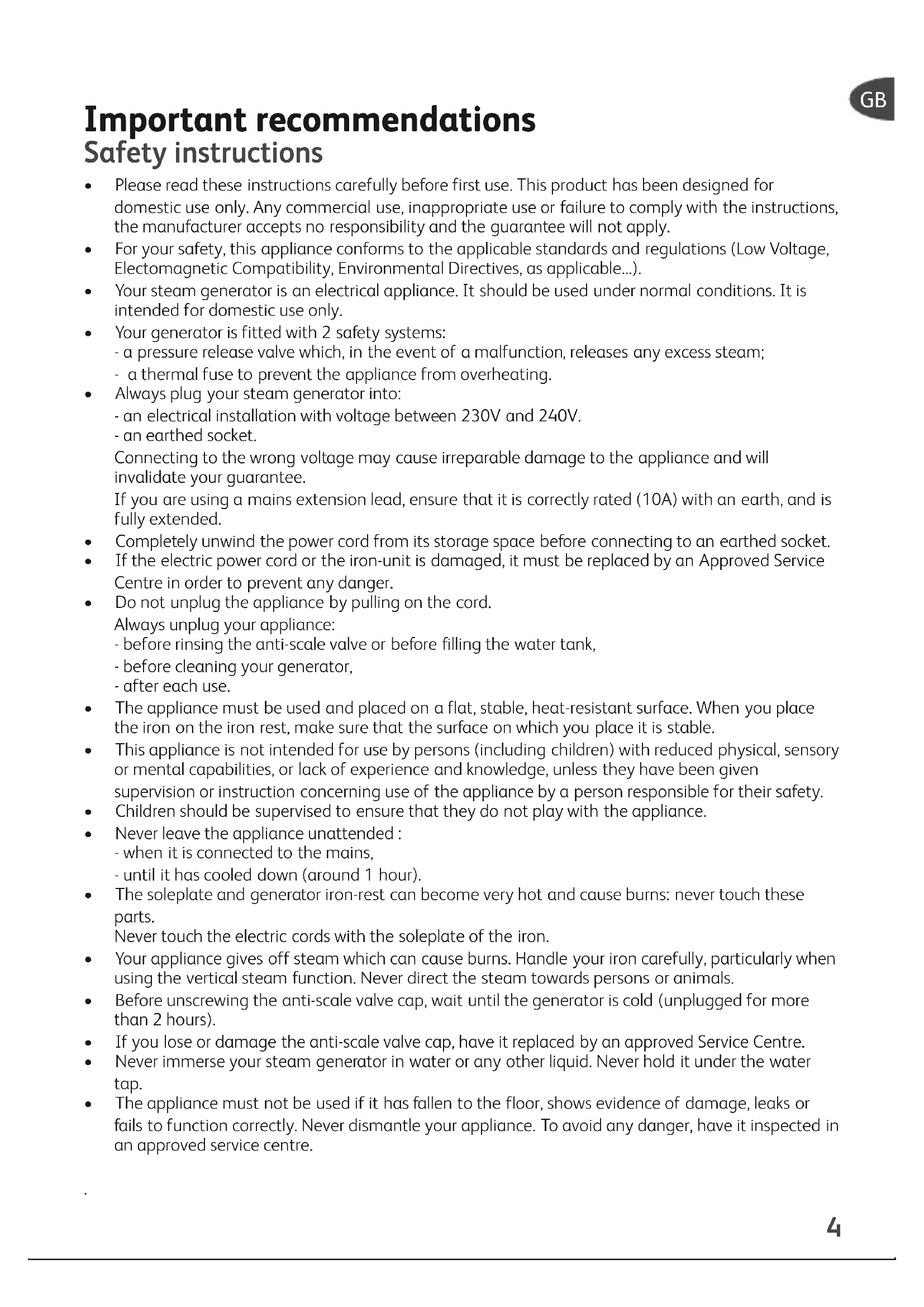 - Your steam generator is an electrical appliance. It should be used under normal conditions. It is intended for domestic use only.