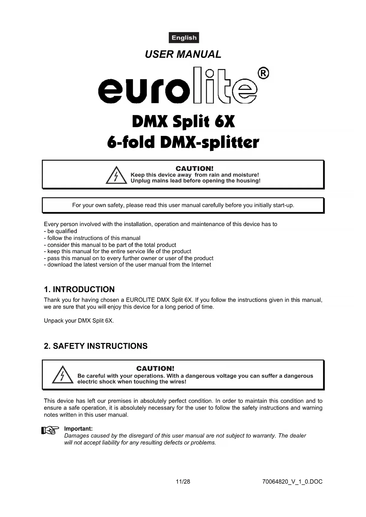 USER MANUAL DMX Split 6X 6-fold DMX-splitter CAUTION! Keep this device away from rain and moisture! Unplug mains lead before opening the housing! For your own safety, please read this user manual carefully before you initially start-up.Every person involved with the installation, operation and maintenance of this device has to- be qualified- follow the instructions of this manual- consider this manual to be part of the total product- keep this manual for the entire service life of the product- pass this manual on to every further owner or user of the product- download the latest version of the user manual from the Internet