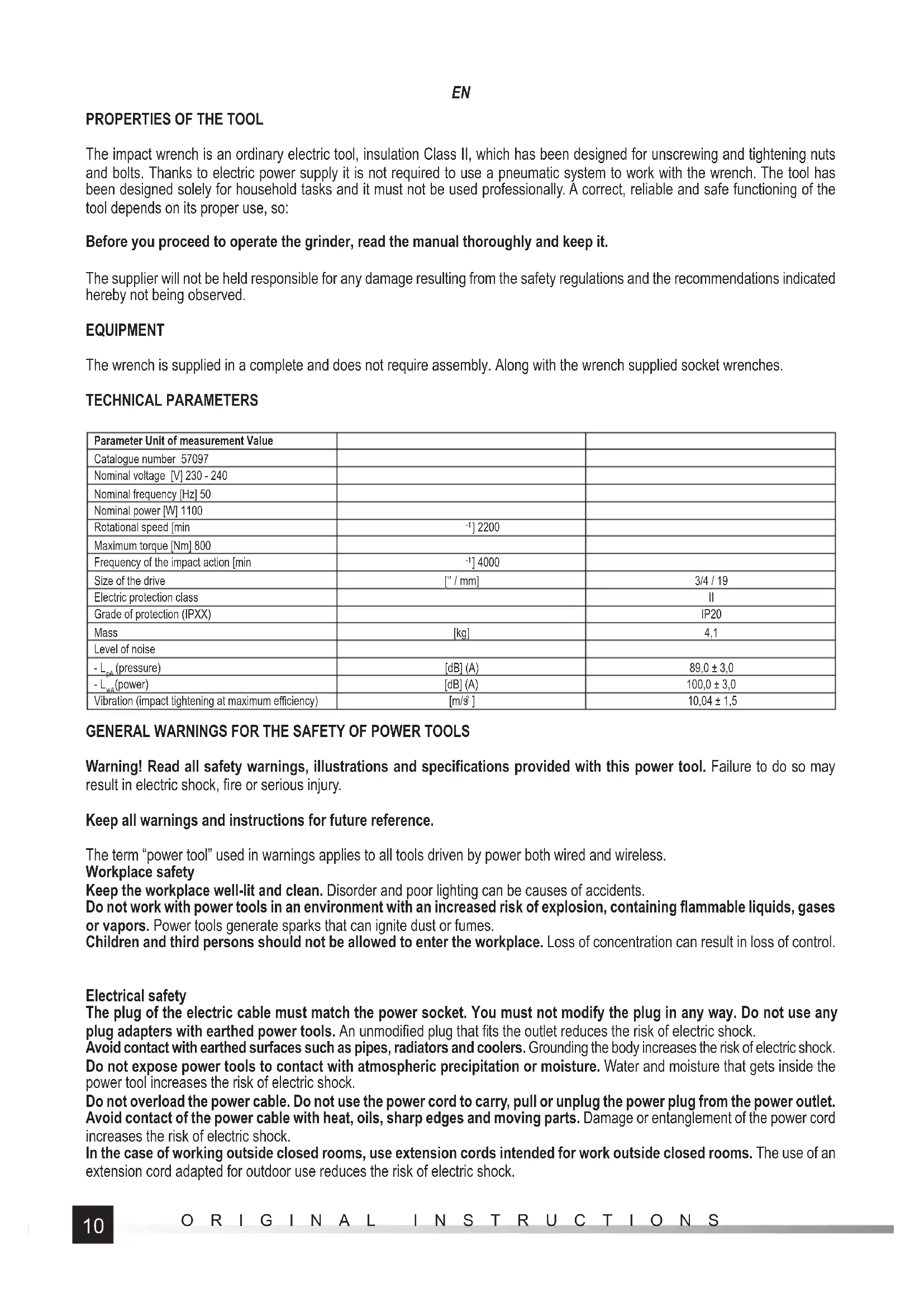 The impact wrench is an ordinary electric tool, insulation Class II, which has been designed for unscrewing and tightening nuts and bolts. Thanks to electric power supply it is not required to use a pneumatic system to work with the wrench. The tool has been designed solely for household tasks and it must not be used professionally. A correct, reliable and safe functioning of the tool depends on its proper use, so: Before you proceed to operate the grinder, read the manual thoroughly and keep it. The supplier will not be held responsible for any damage resulting from the safety regulations and the recommendations indicated hereby not being observed. EQUIPMENT The wrench is supplied in a complete and does not require assembly. Along with the wrench supplied socket wrenches. TECHNICAL PARAMETERS Parameter Unit of measurement Value Catalogue number 57097 Nominal voltage [V] 230 - 240 Nominal frequency [Hz] 50 Nominal power [W] 1100 Rotational speed [min