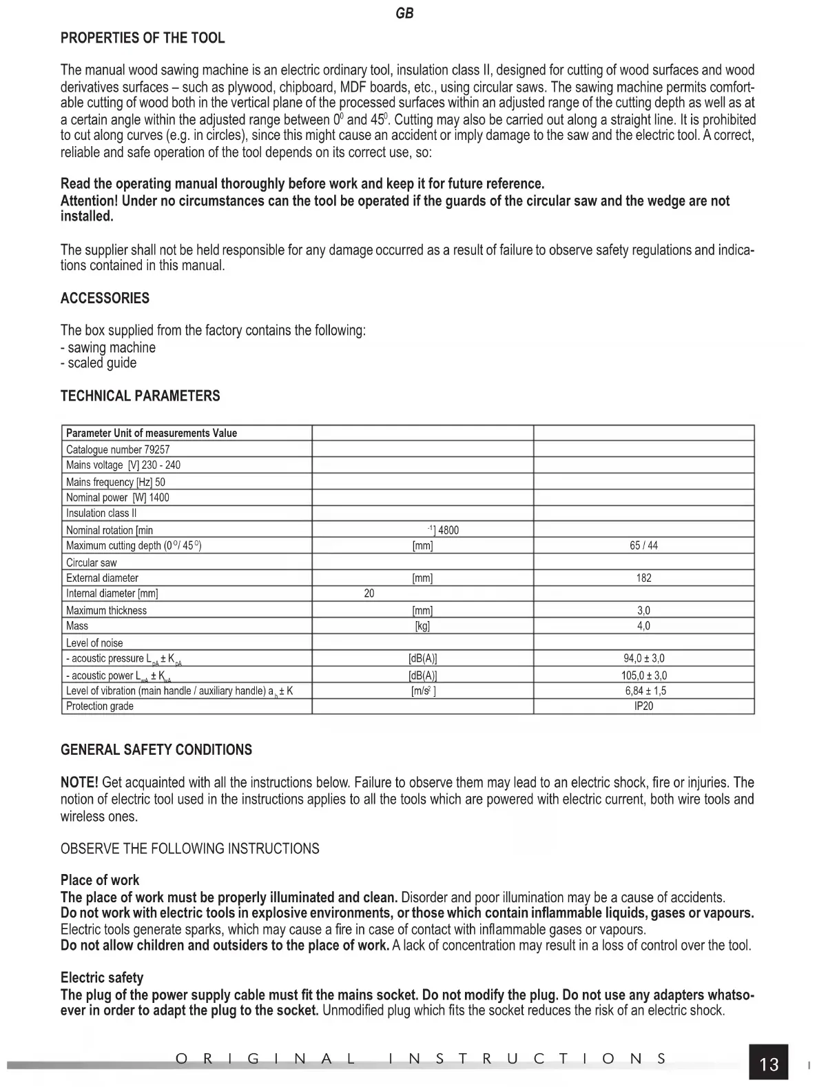 . Cutting may also be carried out along a straight line. It is prohibited to cut along curves (e.g. in circles), since this might cause an accident or imply damage to the saw and the electric tool. A correct, reliable and safe operation of the tool depends on its correct use, so: Read the operating manual thoroughly before work and keep it for future reference. Attention! Under no circumstances can the tool be operated if the guards of the circular saw and the wedge are not installed. The supplier shall not be held responsible for any damage occurred as a result of failure to observe safety regulations and indica- tions contained in this manual. ACCESSORIES The box supplied from the factory contains the following: - sawing machine - scaled guide TECHNICAL PARAMETERS Parameter Unit of measurements Value Catalogue number 79257 Mains voltage [V] 230 - 240 Mains frequency [Hz] 50 Nominal power [W] 1400 Insulation class II Nominal rotation [min