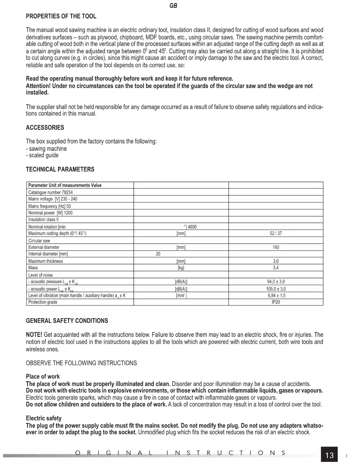 . Cutting may also be carried out along a straight line. It is prohibited to cut along curves (e.g. in circles), since this might cause an accident or imply damage to the saw and the electric tool. A correct, reliable and safe operation of the tool depends on its correct use, so: Read the operating manual thoroughly before work and keep it for future reference. Attention! Under no circumstances can the tool be operated if the guards of the circular saw and the wedge are not installed. The supplier shall not be held responsible for any damage occurred as a result of failure to observe safety regulations and indica- tions contained in this manual. ACCESSORIES The box supplied from the factory contains the following: - sawing machine - scaled guide TECHNICAL PARAMETERS Parameter Unit of measurements Value Catalogue number 79254 Mains voltage [V] 230 - 240 Mains frequency [Hz] 50 Nominal power [W] 1200 Insulation class II Nominal rotation [min