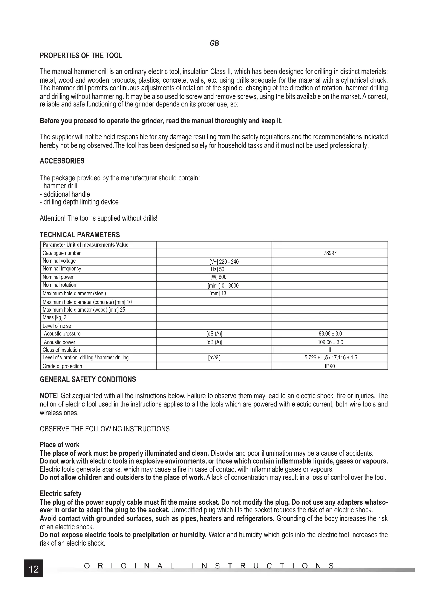 The manual hammer drill is an ordinary electric tool, insulation Class II, which has been designed for drilling in distinct materials: metal, wood and wooden products, plastics, concrete, walls, etc. using drills adequate for the material with a cylindrical chuck. The hammer drill permits continuous adjustments of rotation of the spindle, changing of the direction of rotation, hammer drilling and drilling without hammering. It may be also used to screw and remove screws, using the bits available on the market. A correct, reliable and safe functioning of the grinder depends on its proper use, so: Before you proceed to operate the grinder, read the manual thoroughly and keep it. The supplier will not be held responsible for any damage resulting from the safety regulations and the recommendations indicated hereby not being observed.The tool has been designed solely for household tasks and it must not be used professionally. ACCESSORIES The package provided by the manufacturer should contain: - hammer drill - additional handle - drilling depth limiting device Attention! The tool is supplied without drills! TECHNICAL PARAMETERS Parameter Unit of measurements Value Catalogue number