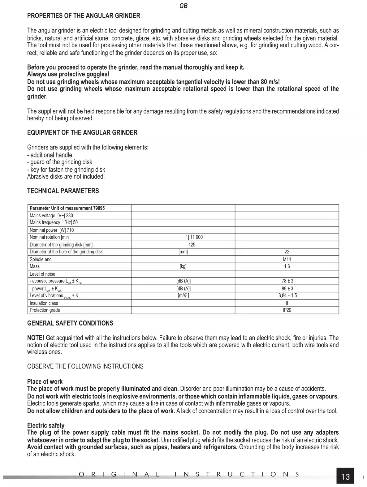 Grinders are supplied with the following elements: - additional handle - guard of the grinding disk - key for fasten the grinding disk Abrasive disks are not included. TECHNICAL PARAMETERS Parameter Unit of measurement 79095 Mains voltage [V~] 230 Mains frequency [Hz] 50 Nominal power [W] 710 Nominal rotation [min