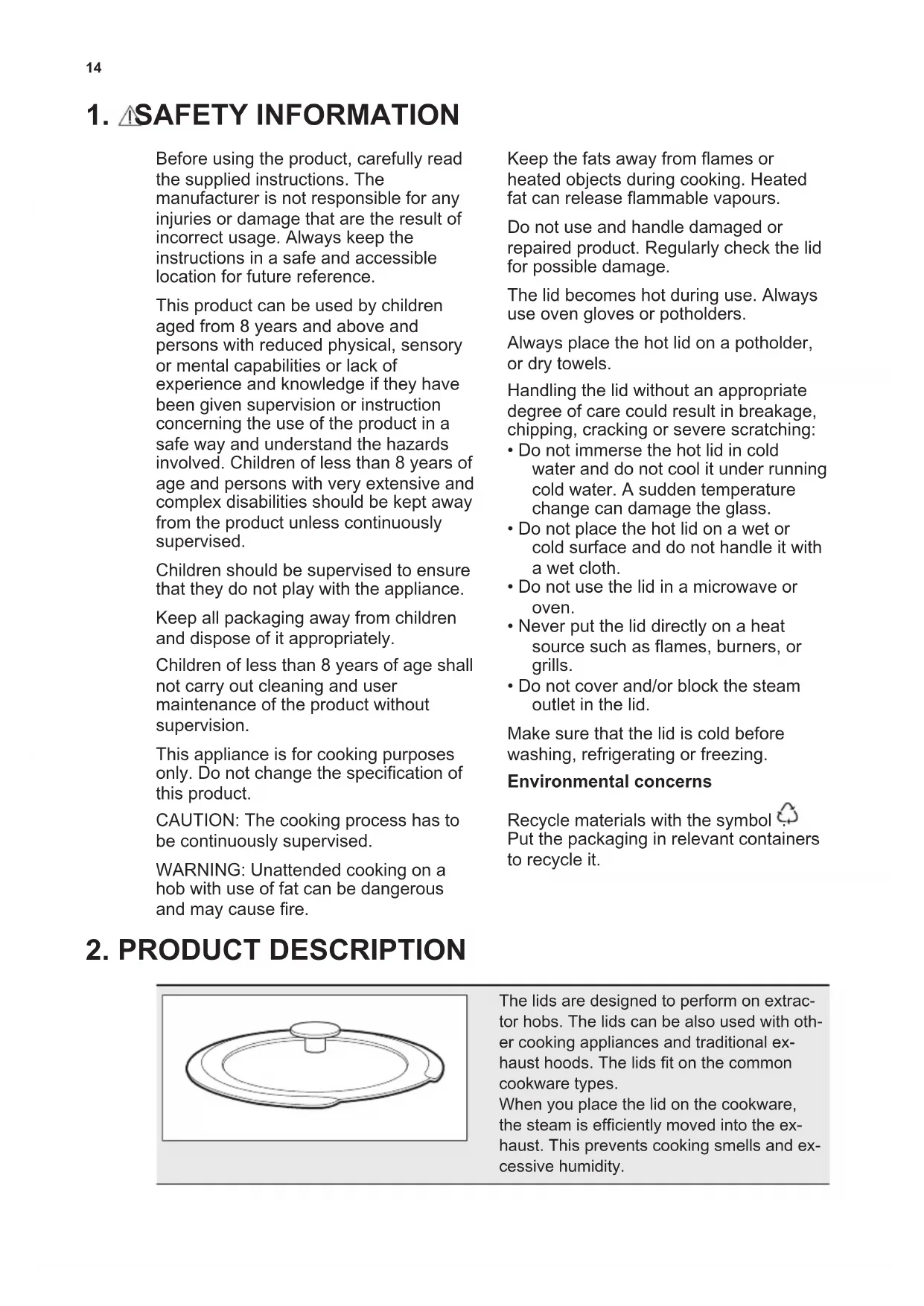 The lids are designed to perform on extrac‐ tor hobs. The lids can be also used with oth‐ er cooking appliances and traditional ex‐ haust hoods. The lids fit on the common cookware types. When you place the lid on the cookware, the steam is efficiently moved into the ex‐ haust. This prevents cooking smells and ex‐ cessive humidity. 14Lids diameter [cm] Small