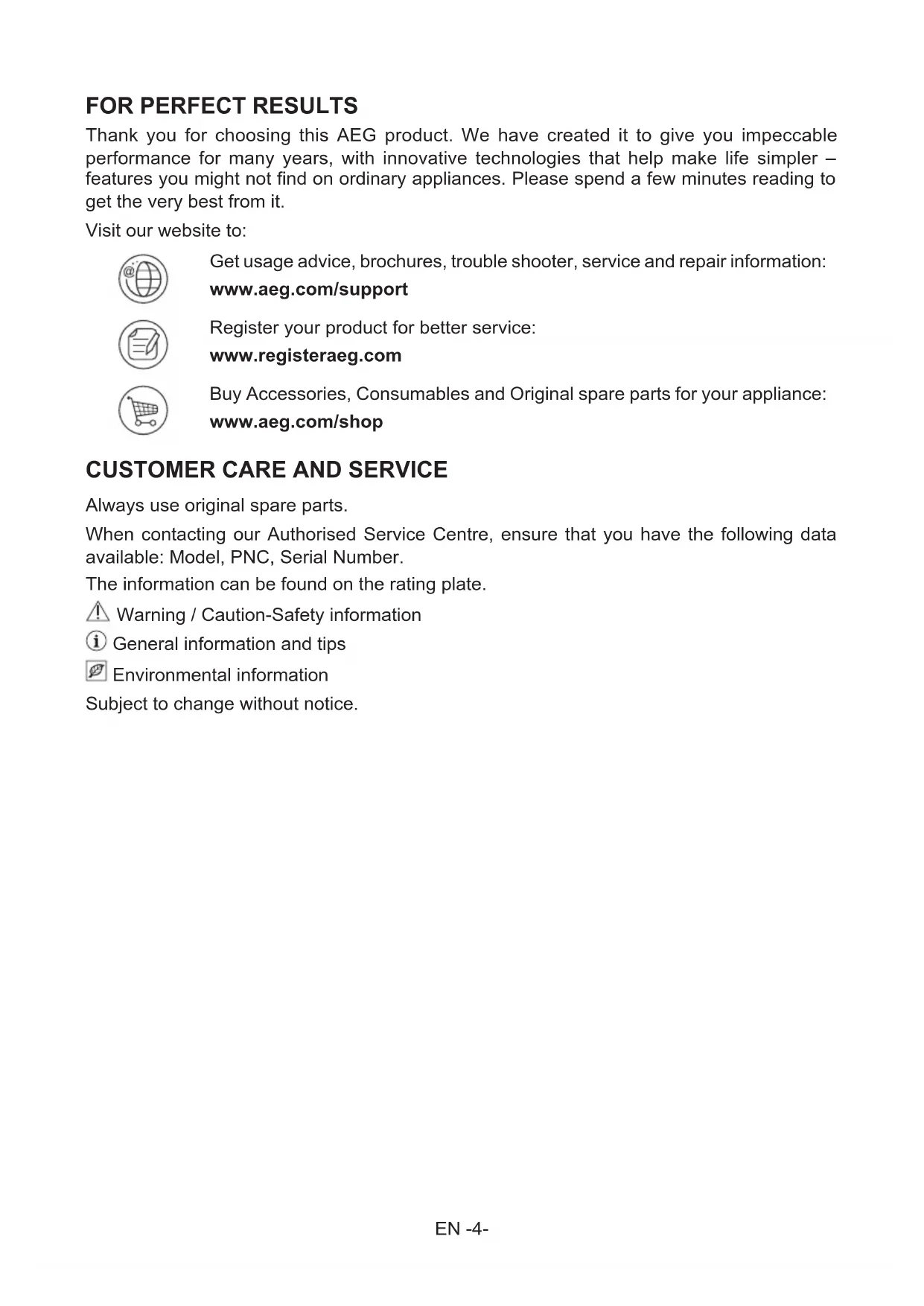Always use original spare parts. When contacting our Authorised Service Centre, ensure that you have the following data available: Model, PNC, Serial Number. The information can be found on the rating plate. Warning / Caution-Safety information General information and tips Environmental information Subject to change without notice.EN -5-
