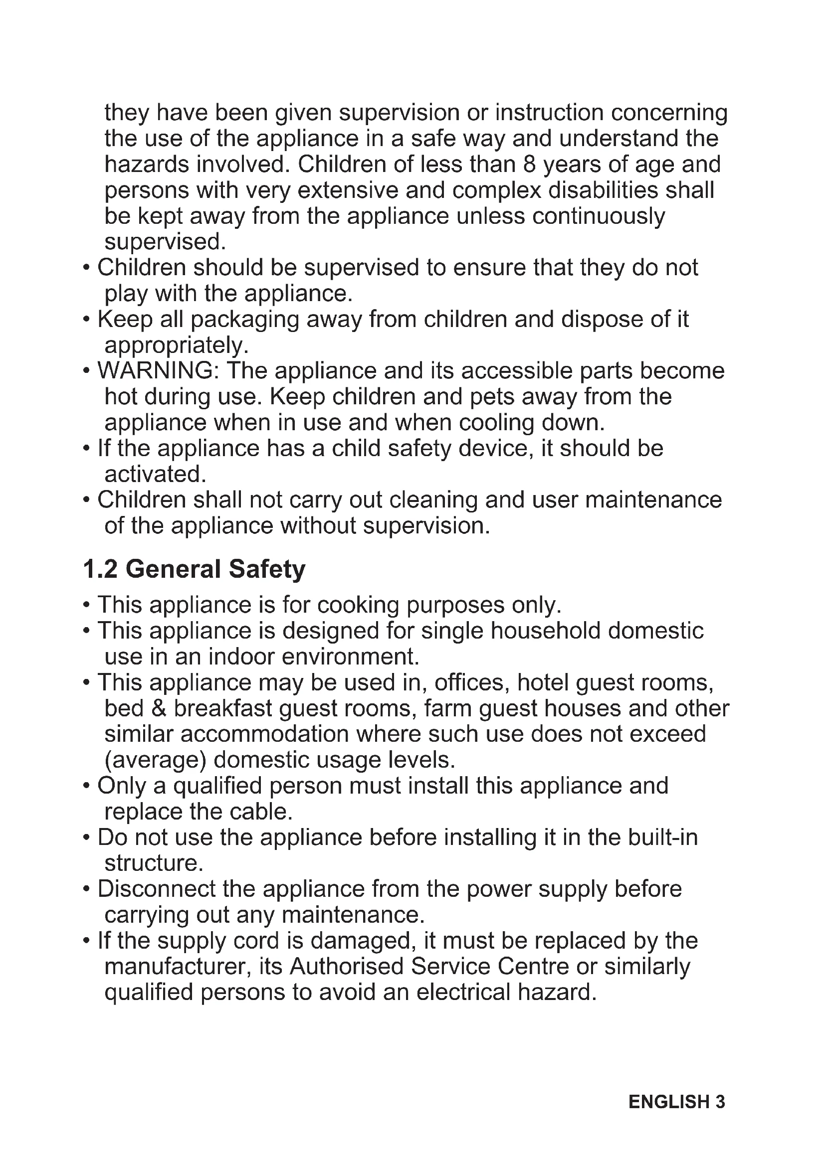 - This appliance can be used by children aged from 8 years and above and persons with reduced physical, sensory or mental capabilities or lack of experience and knowledge if 2 ENGLISHthey have been given supervision or instruction concerning the use of the appliance in a safe way and understand the hazards involved. Children of less than 8 years of age and persons with very extensive and complex disabilities shall be kept away from the appliance unless continuously supervised.