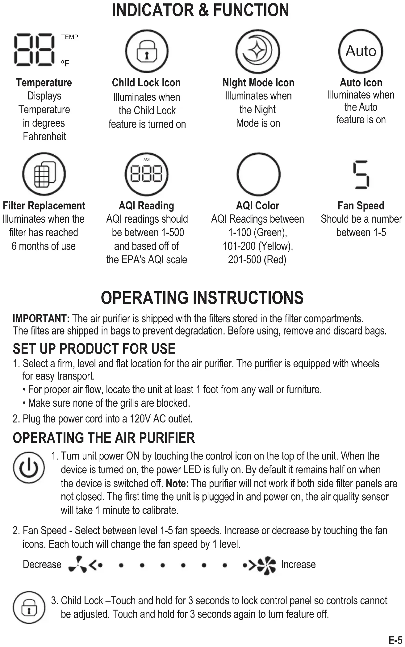 Temperature Displays Temperature in degrees Fahrenheit Child Lock Icon Illuminates when the Child Lock feature is turned on Night Mode Icon Illuminates when the Night Mode is on Auto Icon Illuminates when the Auto feature is on Filter Replacement Illuminates when the filter has reached 6 months of use AQI Reading AQI readings should be between 1-500 and based off of the EPA's AQI scale Fan Speed Should be a number between 1-5 Auto AQI AQI Color AQI Readings between 1-100 (Green), 101-200 (Yellow), 201-500 (Red) OPERATING INSTRUCTIONS IMPORTANT: The air purifier is shipped with the filters stored in the filter compartments. The filtes are shipped in bags to prevent degradation. Before using, remove and discard bags.