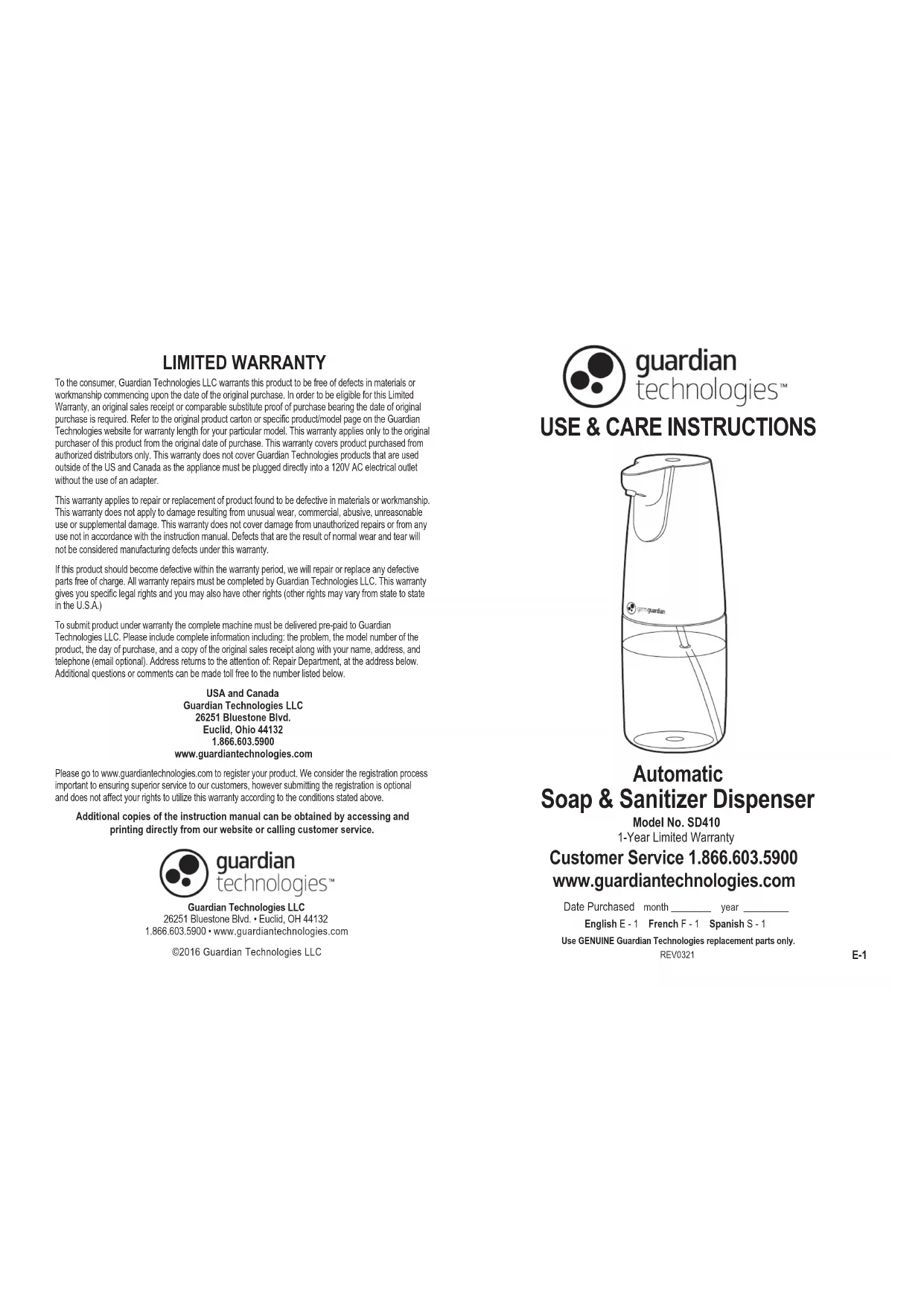 Automatic Soap & Sanitizer Dispenser Model No. SD4101-Year Limited Warranty English E - 1 French F - 1 Spanish S - 1 Date Purchased month ________ year _________ Customer Service 1.866.603.5900 www.guardiantechnologies.com Use GENUINE Guardian Technologies replacement parts only.REV0321 E-1 ©2016 Guardian Technologies LLCGuardian Technologies LLC26251 Bluestone Blvd. • Euclid, OH 441321.866.603.5900 • www.guardiantechnologies.com LIMITED WARRANTY To the consumer, Guardian Technologies LLC warrants this product to be free of defects in materials orworkmanship commencing upon the date of the original purchase. In order to be eligible for this Limited Warranty, an original sales receipt or comparable substitute proof of purchase bearing the date of original purchase is required. Refer to the original product carton or specific product/model page on the Guardian Technologies website for warranty length for your particular model. This warranty applies only to the original purchaser of this product from the original date of purchase. This warranty covers product purchased from authorized distributors only. This warranty does not cover Guardian Technologies products that are used outside of the US and Canada as the appliance must be plugged directly into a 120V AC electrical outlet without the use of an adapter. This warranty applies to repair or replacement of product found to be defective in materials or workmanship. This warranty does not apply to damage resulting from unusual wear, commercial, abusive, unreasonable use or supplemental damage. This warranty does not cover damage from unauthorized repairs or from any use not in accordance with the instruction manual. Defects that are the result of normal wear and tear will not be considered manufacturing defects under this warranty. If this product should become defective within the warranty period, we will repair or replace any defective parts free of charge. All warranty repairs must be completed by Guardian Technologies LLC. This warranty gives you specific legal rights and you may also have other rights (other rights may vary from state to statein the U.S.A.)To submit product under warranty the complete machine must be delivered pre-paid to GuardianTechnologies LLC. Please include complete information including: the problem, the model number of the product, the day of purchase, and a copy of the original sales receipt along with your name, address, and telephone (email optional). Address returns to the attention of: Repair Department, at the address below. Additional questions or comments can be made toll free to the number listed below.USA and CanadaGuardian Technologies LLC26251 Bluestone Blvd.Euclid, Ohio 441321.866.603.5900www.guardiantechnologies.comAdditional copies of the instruction manual can be obtained by accessing andprinting directly from our website or calling customer service.Please go to www.guardiantechnologies.com to register your product. We consider the registration processimportant to ensuring superior service to our customers, however submitting the registration is optional and does not affect your rights to utilize this warranty according to the conditions stated above.E-2 E-3