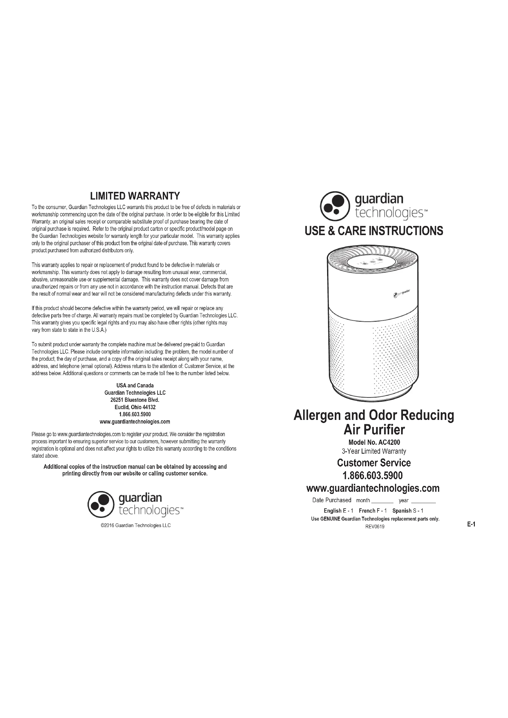 E-1 Allergen and Odor Reducing Air Purifier Model No. AC4200 3-Year Limited Warranty English E - 1 French F - 1 Spanish S - 1 Date Purchased month ________ year _________