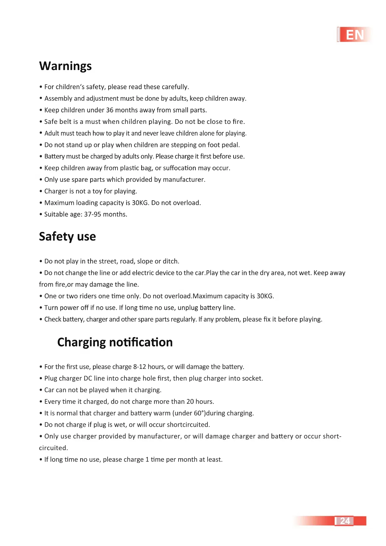 - Charge it aer use and must be done by adults only. If longme no use, please charge it 1 me per month, in order tomaintain baery.